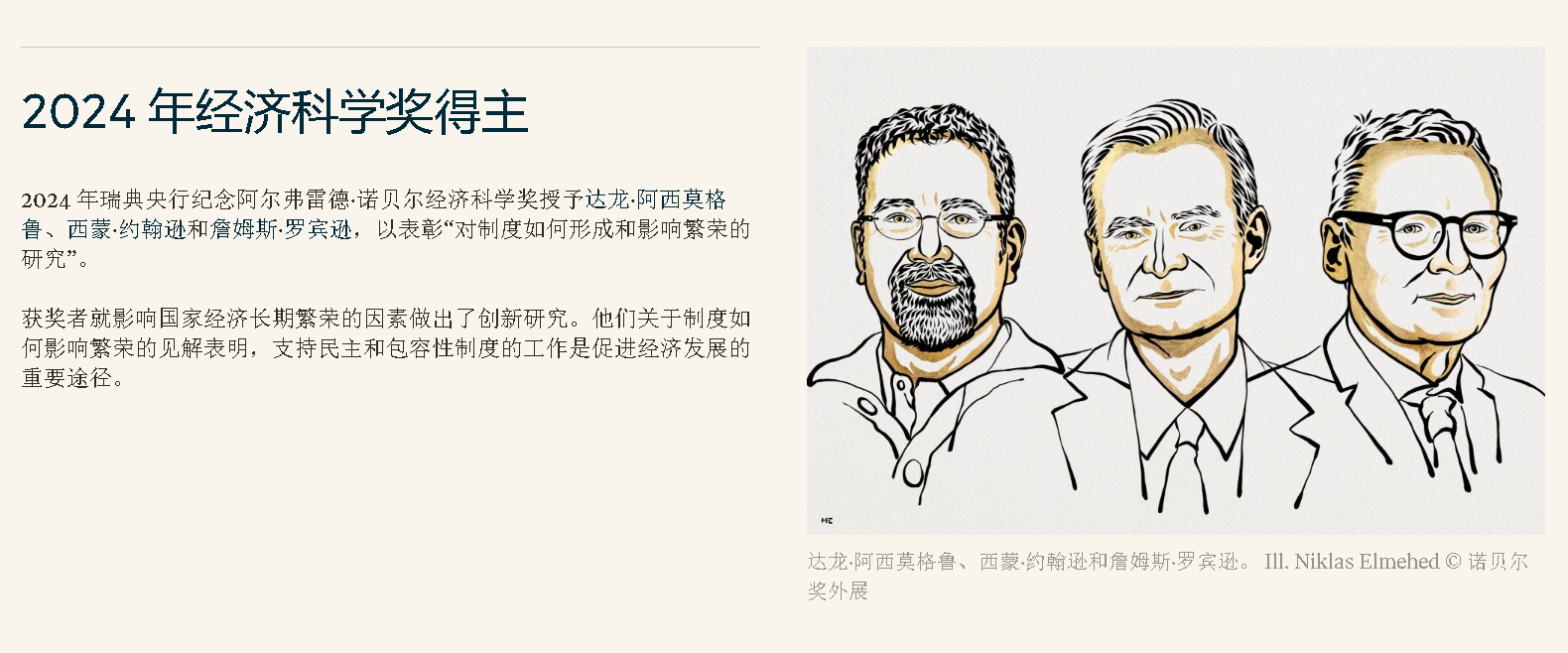 達龍·阿西莫格魯、西蒙·約翰遜和詹姆斯·羅賓遜就影響國家經濟長期繁榮的因素做出了創新研究。他們的實證研究證明了殖民時期引入的政治和經濟制度類型的根本重要性。他們的理論研究有助于我們理解為什么改革榨取式制度如此困難,同時也指出了這種情況仍然可能發生的一些情況。獲獎者的工作對經濟學和政治學的持續研究產生了決定性影響。他們關于制度如何影響繁榮的見解表明,支持民主和包容性制度的工作是促進經濟發展的重要途徑。