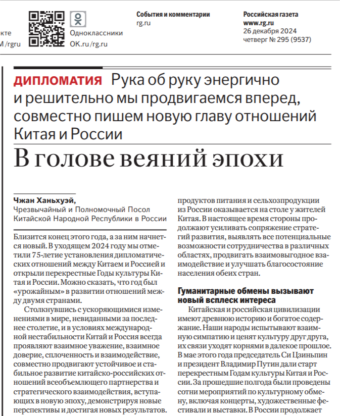 12月26日,張漢暉大使在俄政府機關報《俄羅斯報》發表署名文章《攜手前行 踔厲奮進 共同譜寫中俄關系新華章》,全文如下: