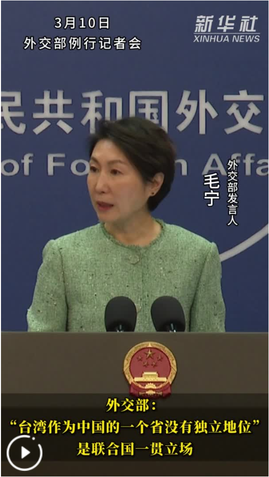 毛寧表示,1971年聯大第2758號決議明確了世界上只有一個中國,臺灣不是一個國家,臺灣是中國的一部分,明確了中國在聯合國的席位只有一個,中華人民共和國政府是唯一合法代表。為恪守這一決議規定,聯合國及其專門機構在提及臺灣時,使用的稱謂就是“中國臺灣省”(Taiwan, Province of China)。聯合國秘書處法律事務辦公室官方法律意見明確指出,“臺灣作為中國的一個省沒有獨立地位”。這是聯合國的一貫立場,均有案可查。