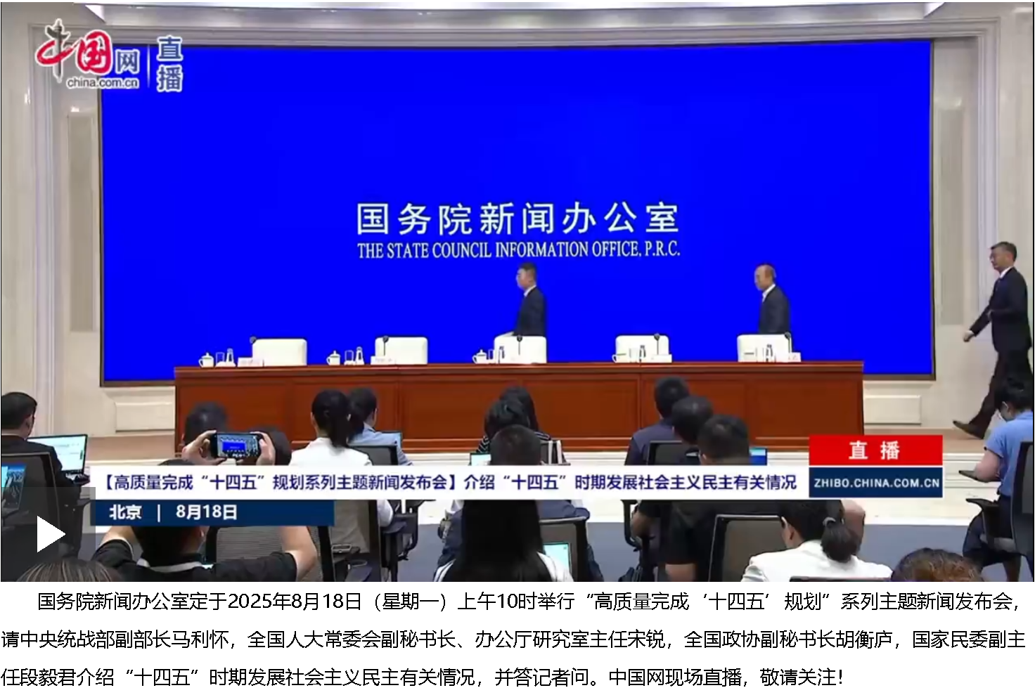 8月18日,國務(wù)院新聞辦公室在北京舉行“高質(zhì)量完成‘十四五’規(guī)劃”系列主題新聞發(fā)布會(huì)。中央統(tǒng)戰(zhàn)部副部長馬利懷,全國人大常委會(huì)副秘書長、辦公廳研究室主任宋銳,全國政協(xié)副秘書長胡衡廬,國家民委副主任段毅君介紹“十四五”時(shí)期發(fā)展社會(huì)主義民主有關(guān)情況,并答記者問。