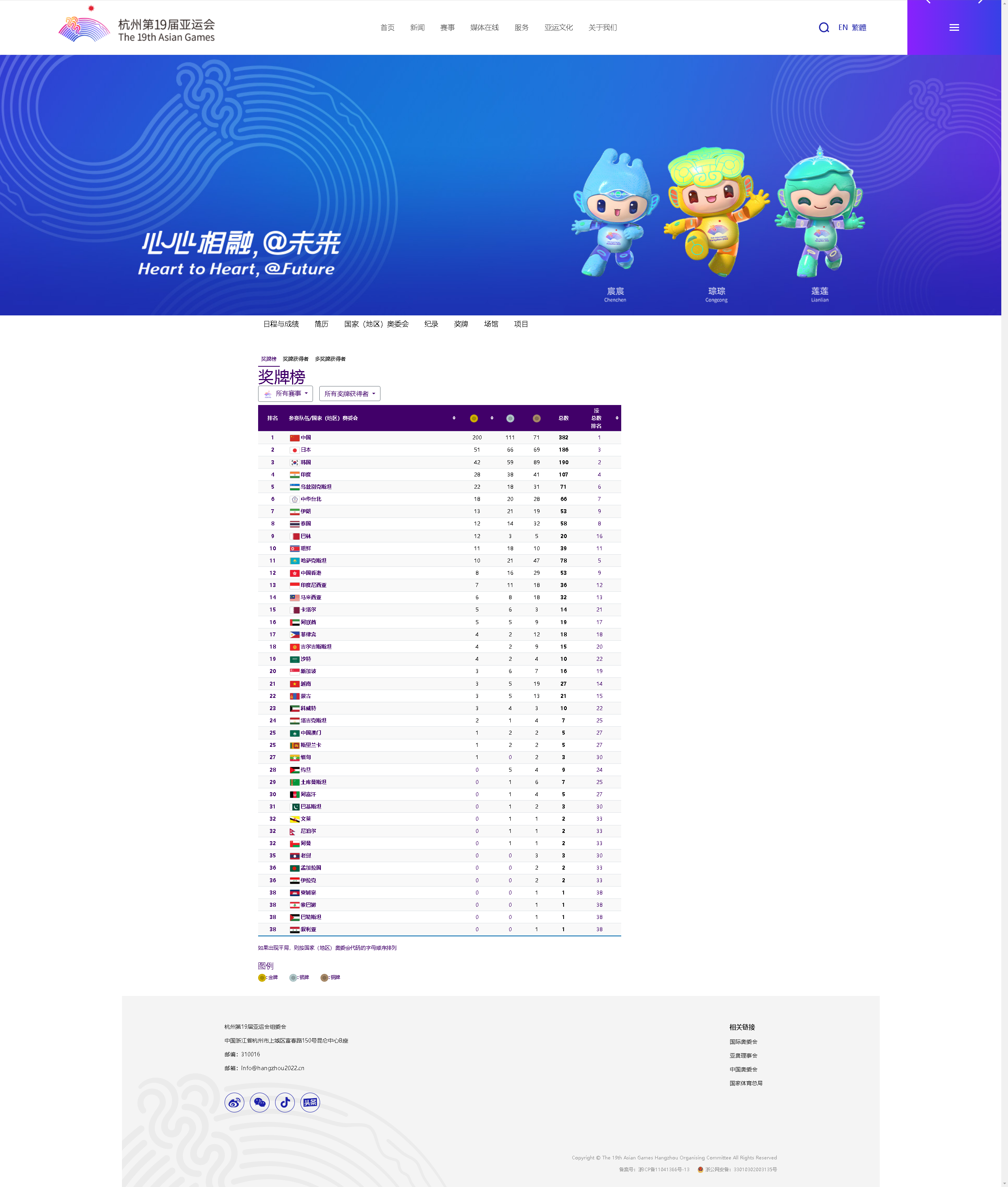 獎(jiǎng)牌榜上,中國隊(duì)以200金111銀71銅位居第一,排在后面的日本隊(duì)獲得51金66銀69銅,韓國隊(duì)獲得42金59銀89銅。