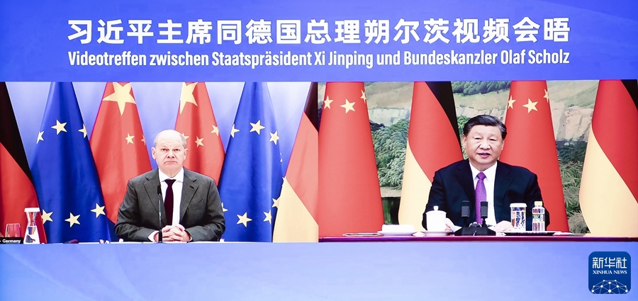 11月3日下午,國家主席習近平同德國總理朔爾茨舉行視頻會晤。新華社記者 黃敬文 攝