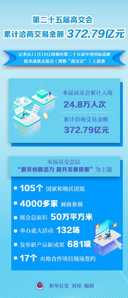 新華社深圳11月19日電(記者陳宇軒)記者從19日閉幕的第二十五屆中國國際高新技術成果交易會(簡稱“高交會”)上獲悉,本屆高交會累計入場24.8萬人次,累計洽商交易金額372.79億元。