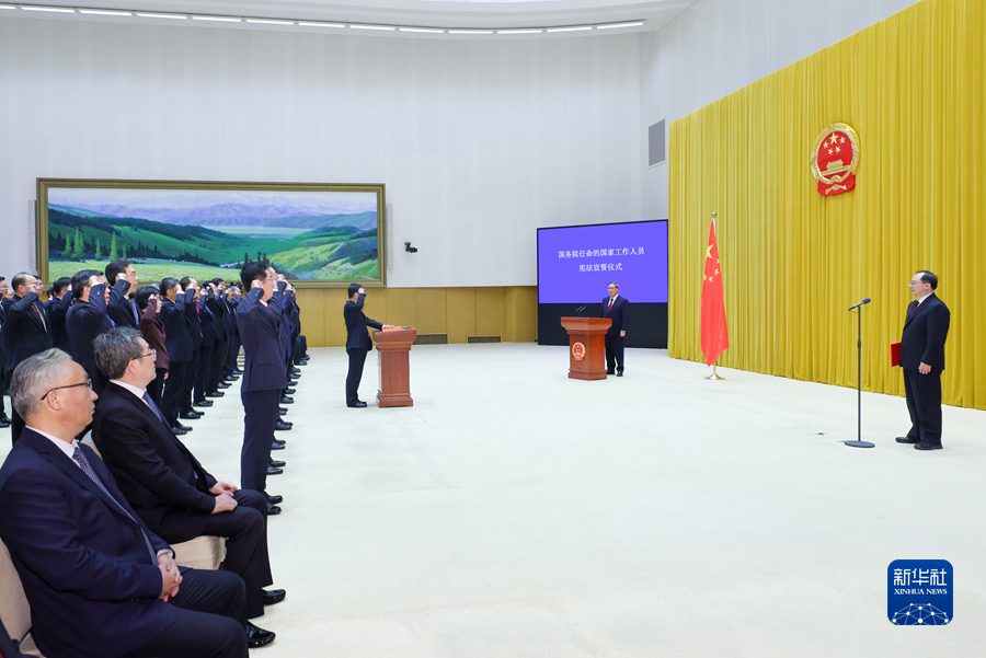 宣誓后,國(guó)務(wù)院總理李強(qiáng)作了講話。他強(qiáng)調(diào),誓詞雖短,但字字千鈞,希望大家把錚錚誓言銘記于心、踐之于行,忠于憲法、忠于祖國(guó)、忠于人民,不辜負(fù)黨和人民的重托。要堅(jiān)持用習(xí)近平新時(shí)代中國(guó)特色社會(huì)主義思想凝心鑄魂,深刻領(lǐng)悟“兩個(gè)確立”的決定性意義,堅(jiān)決做到“兩個(gè)維護(hù)”,不斷提高政治判斷力、政治領(lǐng)悟力、政治執(zhí)行力,當(dāng)好貫徹黨中央決策部署的執(zhí)行者、行動(dòng)派、實(shí)干家。要倍加珍惜黨和人民賦予的平臺(tái),以?shī)^發(fā)有為的精神狀態(tài)干事創(chuàng)業(yè),緊緊圍繞推進(jìn)高質(zhì)量發(fā)展這個(gè)首要任務(wù),持續(xù)深化改革、擴(kuò)大開(kāi)放、推動(dòng)創(chuàng)新、改善民生,勇于打破常規(guī),善于開(kāi)辟新局,抓住主要矛盾綜合施策,聚焦瓶頸制約持續(xù)攻堅(jiān),以實(shí)干實(shí)績(jī)踐行誓言。要牢固樹(shù)立正確的權(quán)力觀、政績(jī)觀、事業(yè)觀,嚴(yán)格按照法定權(quán)限和程序履行職責(zé)、行使權(quán)力、承擔(dān)責(zé)任,始終繃緊廉潔自律這根弦,時(shí)時(shí)處處嚴(yán)格要求自己,堅(jiān)決反對(duì)形式主義、官僚主義,大力弘揚(yáng)勤儉節(jié)約、艱苦奮斗的優(yōu)良作風(fēng),為全面建設(shè)社會(huì)主義現(xiàn)代化國(guó)家、實(shí)現(xiàn)中華民族偉大復(fù)興中國(guó)夢(mèng)不懈奮斗。