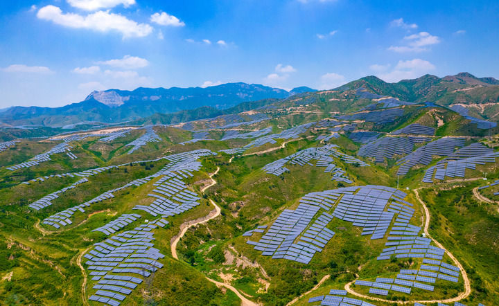 2023年7月18日,在山西省運(yùn)城市稷山縣100MW光儲(chǔ)一體化項(xiàng)目基地,一排排整齊的光伏板與遠(yuǎn)處的青山交相輝映。近年來,稷山縣因地制宜流轉(zhuǎn)荒山荒坡發(fā)展光伏產(chǎn)業(yè),增加農(nóng)民收入,助力鄉(xiāng)村振興。(山西省委辦公廳 供圖)
