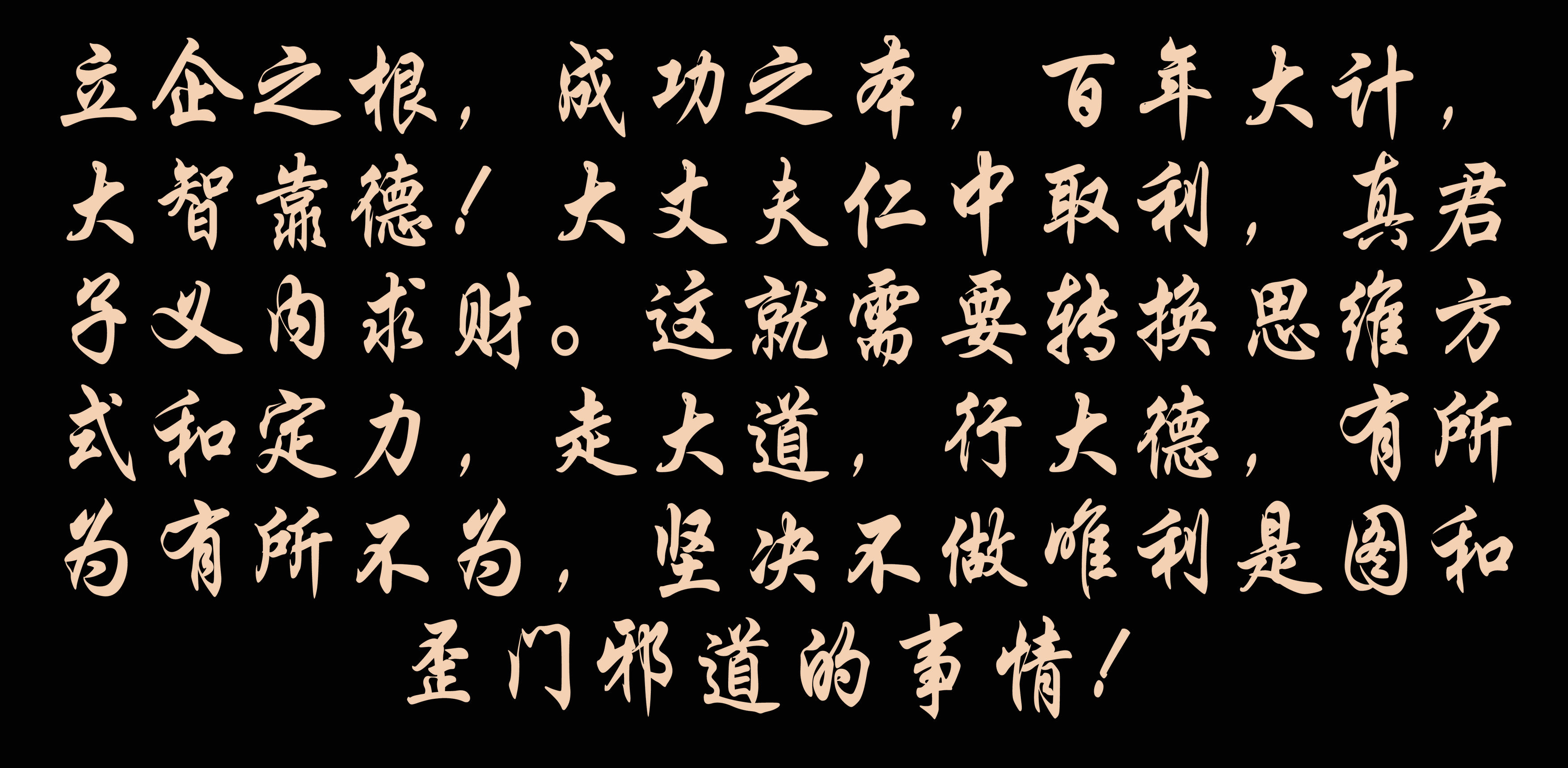 立企之根,成功之本,百年大計,大智靠德!大丈夫仁中取利,真君子義內求財。這就需要轉換思維方式和定力,走大道,行大德,有所為有所不為,堅決不做唯利是圖和歪門邪道的事情,把自己的前途和命運牢牢把握在自己手中,經得起耐的住各種各樣的誘惑和考驗,誠信做人,仁義做事,為子孫后代做好成就百年企業的榜樣!