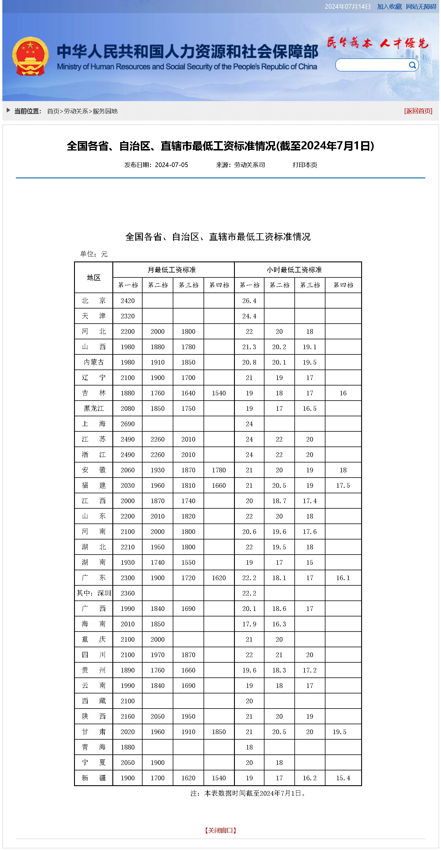 全國各省、自治區、直轄市最低工資標準情況(截至2024年7月1日)