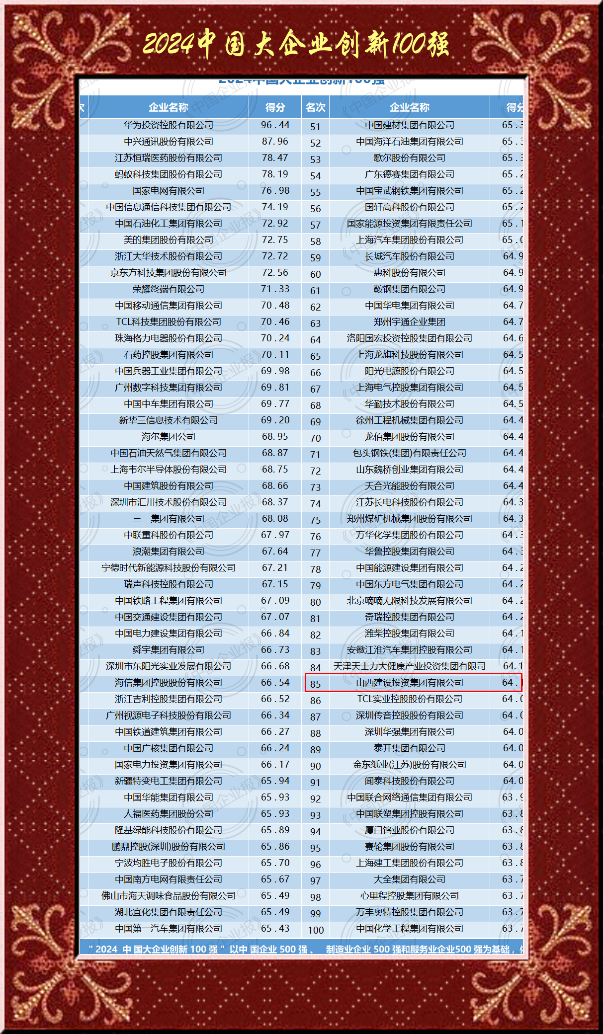 本報訊(記者晉帥妮)近日,中國企業聯合會、中國企業家協會發布“2024中國大企業創新100強”名單,山西建投集團成為我省唯一上榜企業,位列第85位。
