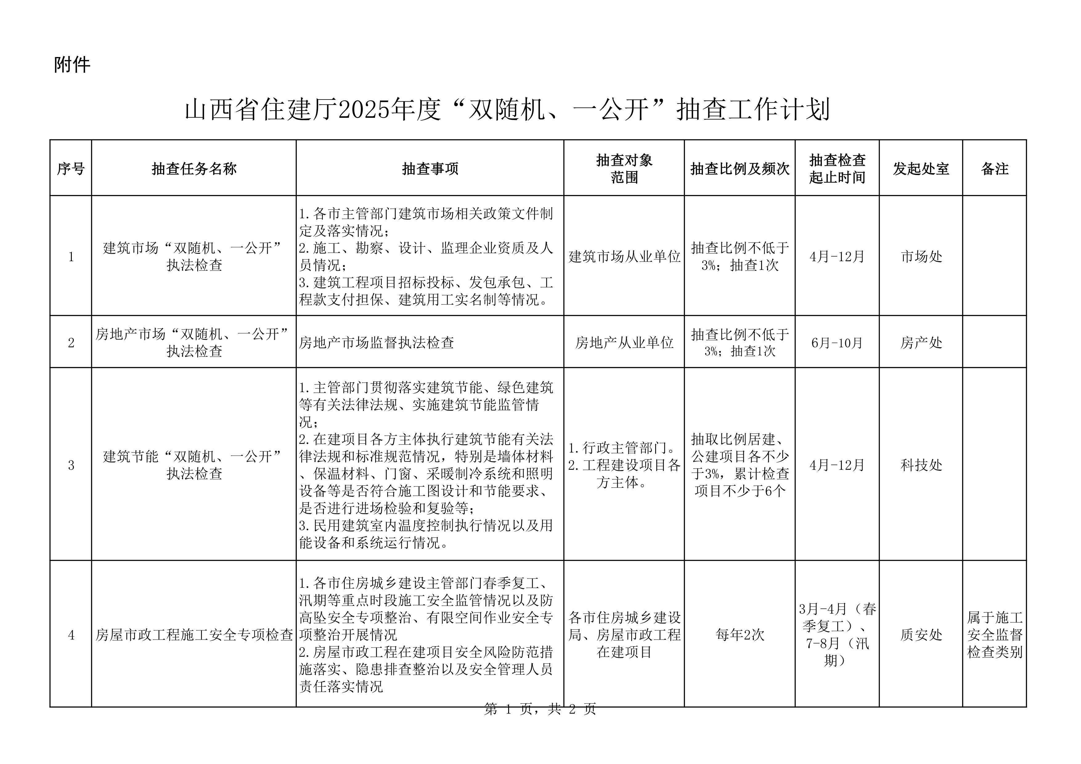 為進(jìn)一步貫徹落實(shí)國(guó)家及我省關(guān)于“雙隨機(jī)、一公開”監(jiān)管工作的決策部署,切實(shí)做好我省住建領(lǐng)域“雙隨機(jī)、一公開”監(jiān)管工作,按照《山西省人民政府辦公廳關(guān)于印發(fā)〈山西省嚴(yán)格規(guī)范涉企行政檢查的若干措施〉的通知》(晉政辦發(fā)〔2025〕9號(hào))、《山西省住房和城鄉(xiāng)建設(shè)廳關(guān)于印發(fā)〈“雙隨機(jī)、一公開”抽查工作細(xì)則〉的通知》(晉建市規(guī)字〔2022〕160號(hào))要求,經(jīng)商有關(guān)處室,制定了《山西省住建廳2025年度“雙隨機(jī)、一公開”抽查工作計(jì)劃》,現(xiàn)印發(fā)給你們,并就有關(guān)事項(xiàng)通知如下: