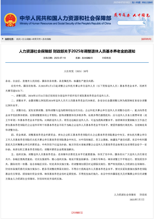 日前,人力資源社會保障部、財(cái)政部印發(fā)《關(guān)于2025年調(diào)整退休人員基本養(yǎng)老金的通知》。具體如何調(diào)整,一起來了解一下。