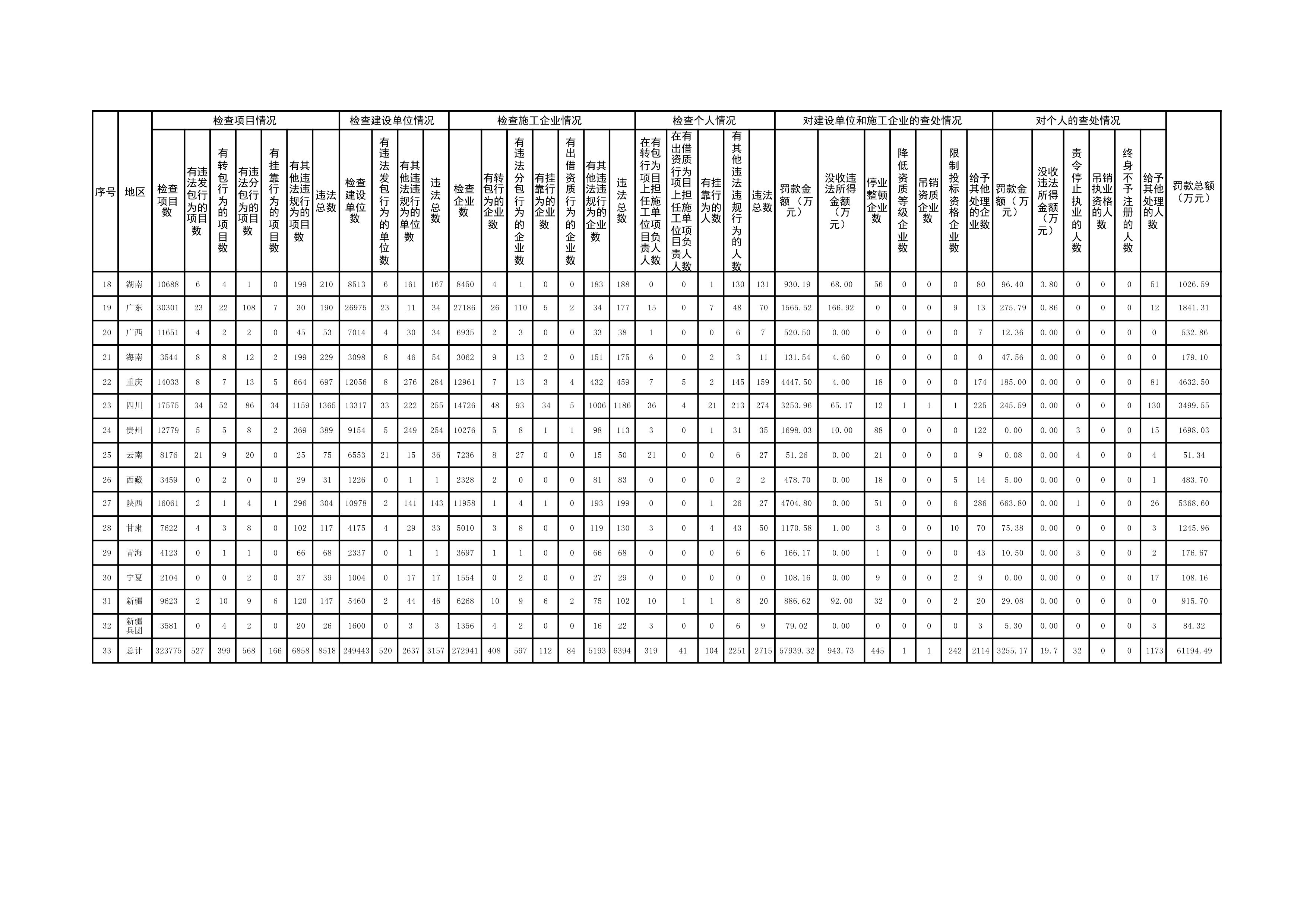 各地住房和城鄉(xiāng)建設(shè)主管部門對存在違法違規(guī)行為的企業(yè)和人員,分別采取停業(yè)整頓、降低資質(zhì)等級、吊銷資質(zhì)、責(zé)令停止執(zhí)業(yè)、通報批評、沒收違法所得、罰款、信用懲戒等行政處罰或行政管理措施。其中,責(zé)令停業(yè)整頓的企業(yè)445家,降低資質(zhì)等級的企業(yè)1家,吊銷資質(zhì)的企業(yè)1家,限制投標(biāo)資格的企業(yè)242家,給予通報批評、信用懲戒等處理的企業(yè)2114家;責(zé)令停止執(zhí)業(yè)32人,給予通報批評等處理1173人;沒收違法所得總額963.43萬元(含個人違法所得19.7萬元),罰款總額61194.49萬元(含個人罰款3255.17萬元)。