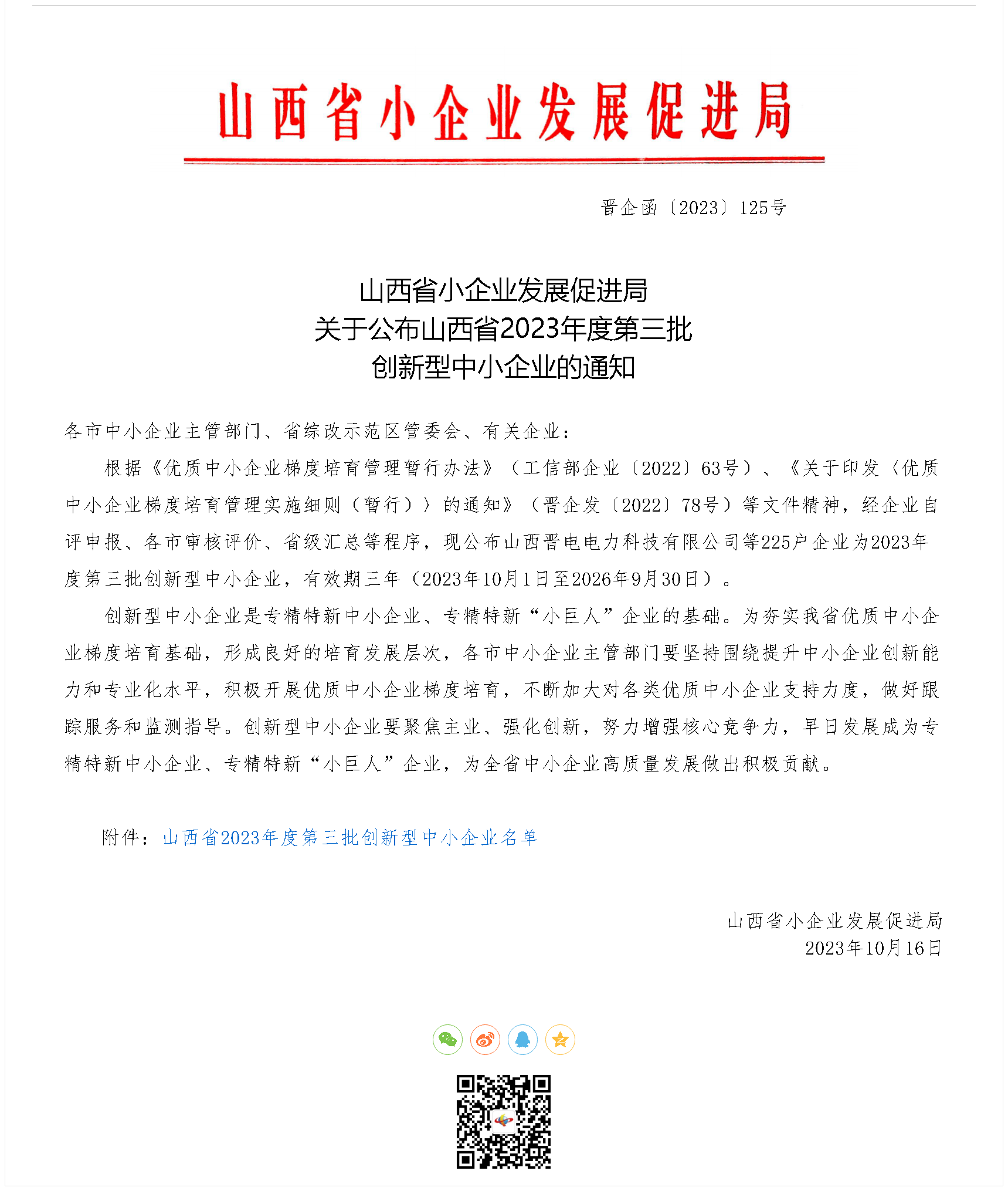經企業自評申報、各市審核評價、省級匯總等程序,10月16日,2023年度全省第三批創新型中小企業名單公布,太原市有4家企業上榜。