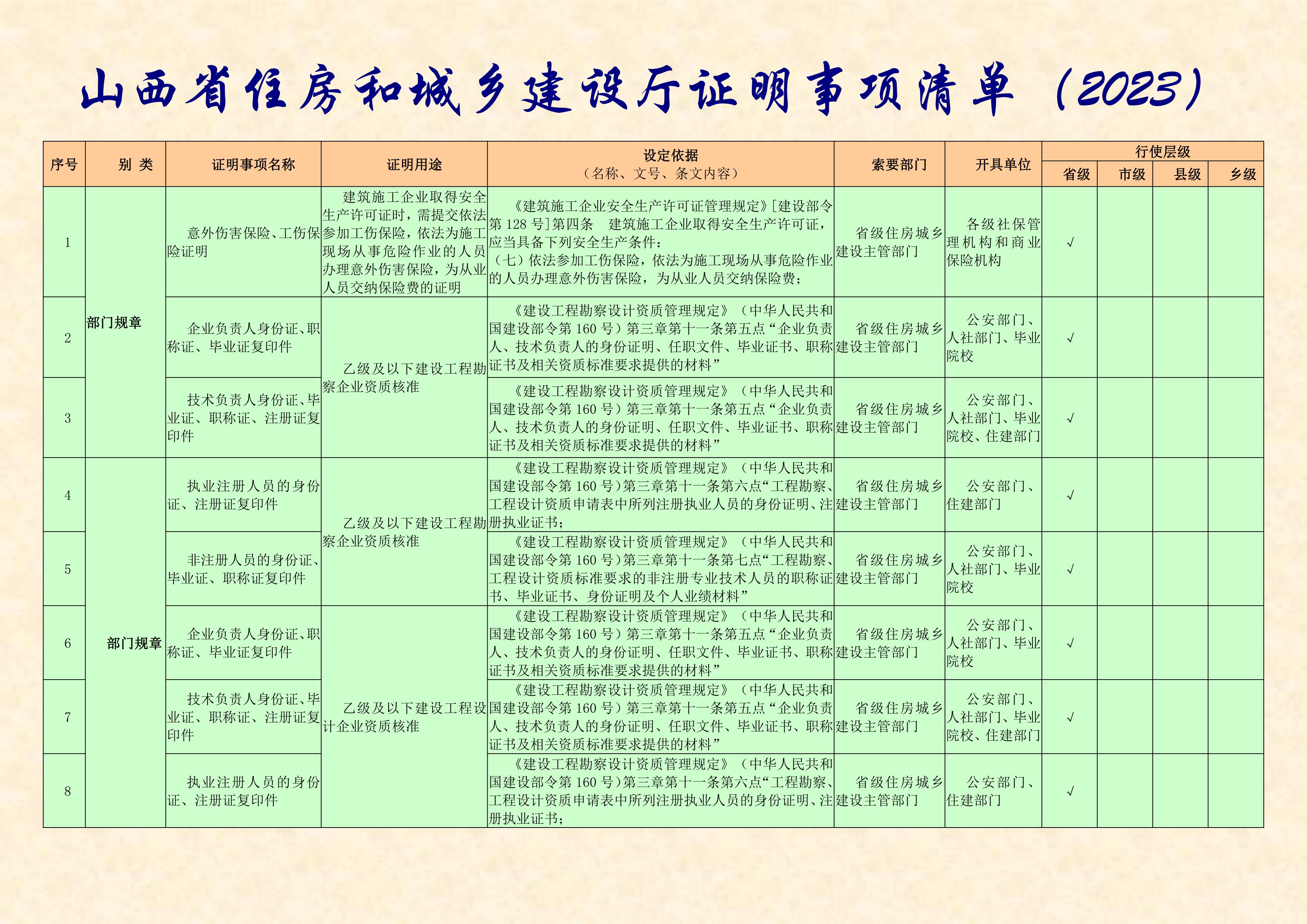 山西省住房和城鄉建設廳證明事項清單(2023)