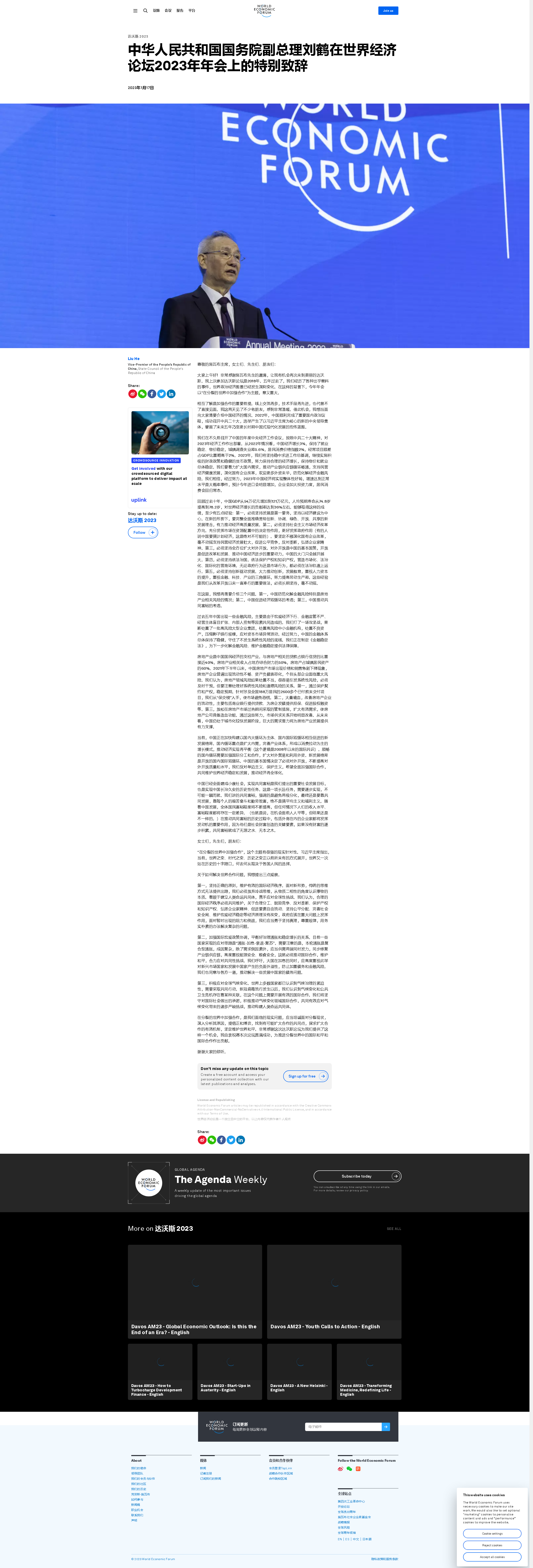 中華人民共和國國務院副總理劉鶴在世界經濟論壇2023年年會上的特別致辭