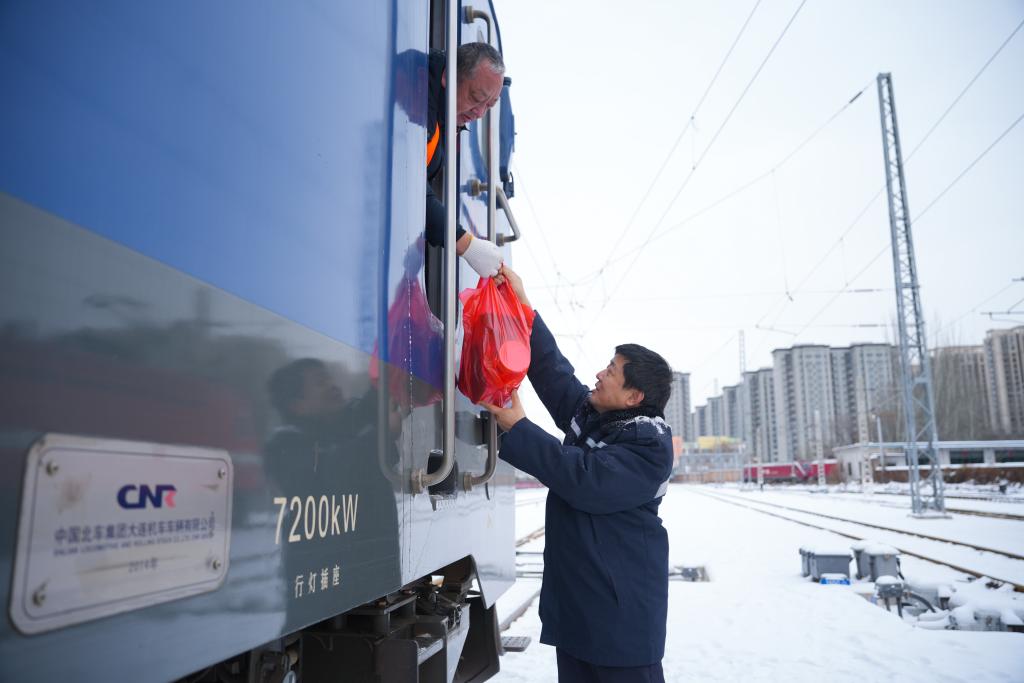 在太原火車站,工作人員將應急食品送到機車司機手中。(中國鐵路太原局集團有限公司供圖)
