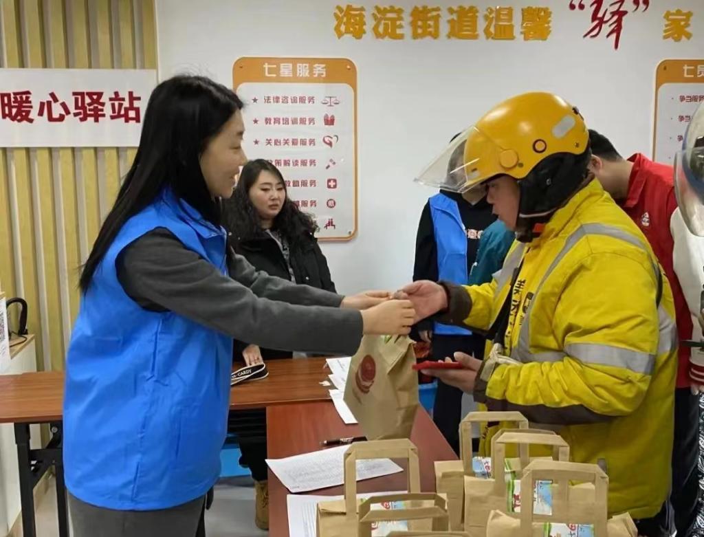 在北京市海淀區海淀街道,“溫馨驛家”13日開展了“小哥加油站,活力‘心’早餐”愛心活動,街道志愿者們將早餐提前打包好,發放愛心早餐50余份。“一早忙起來沒時間吃飯,沒想到在這還能吃到早餐,喝到熱騰騰的咖啡,特別感動。”一位外賣小哥說。
