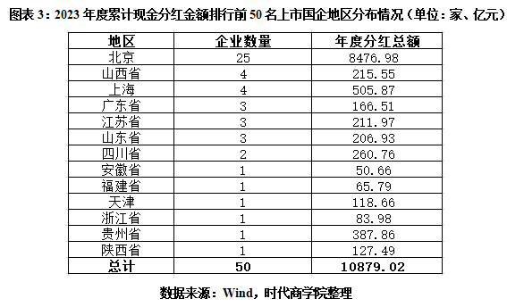 從地區分布情況來看,如圖表3所示,2023年度累計現金分紅金額排名前50的上市國企中,北京地區占據半數,總計25家;山西省、上海市各4家,廣東省、江蘇省、山東省各3家;四川省2家;安徽省、福建省、天津、浙江省、貴州省、陜西省各1家。
