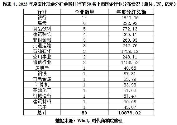 此外,從行業分布情況來看,如圖表4所示,2023年度累計現金分紅金額排名前50的上市國企中,數量最多的為上市銀行(申萬一級,下同),共14家,占比達28%。