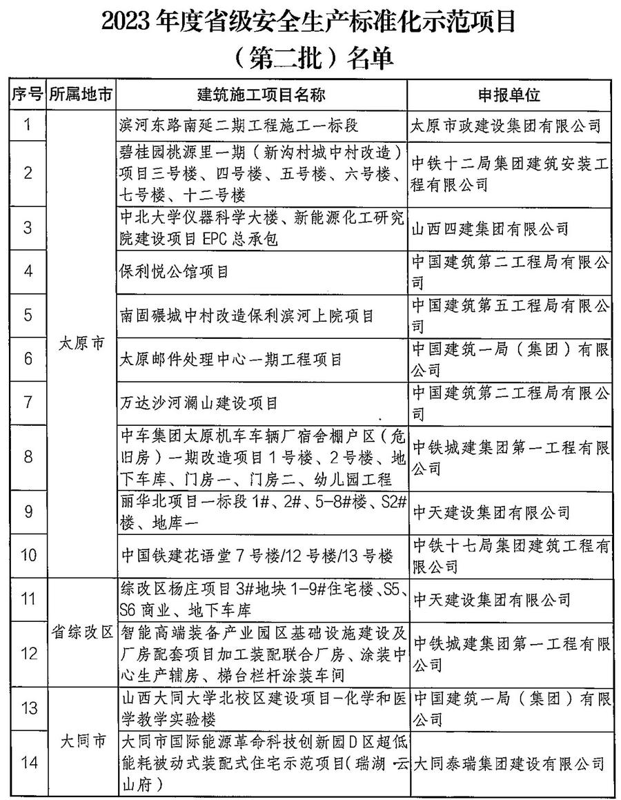 根據《山西省住房和城鄉建設廳建筑施工安全生產標準化創建和考評實施細則》,經企業自主申報,省廳組織專家資料審查、現場核查,評定山西一建集團有限公司等14個企業為2023年度“省級安全生產標準化示范企業”,評定濱河東路南延二期工程施工一標段等38個項目為2023年度第二批“省級安全生產標準化示范項目”,且經公示無異議,現將名單予以公布。