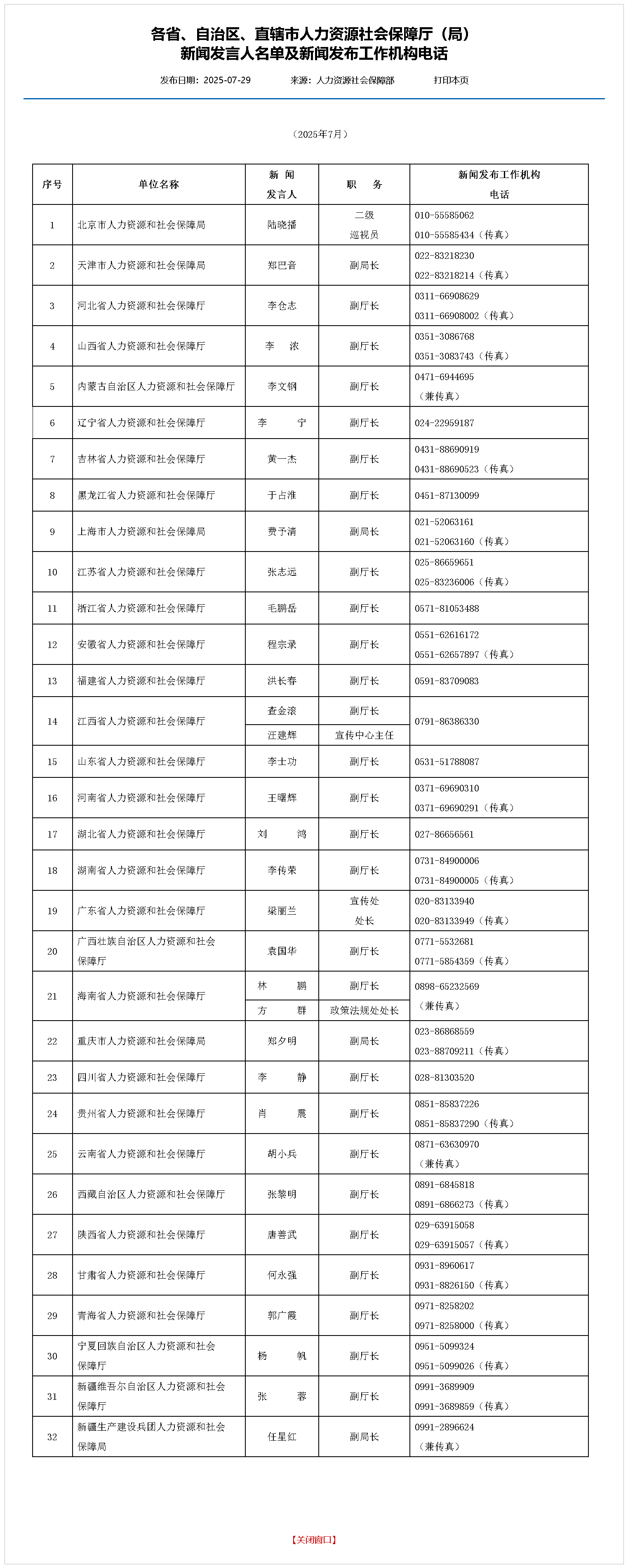 31 新疆維吾爾自治區(qū)人力資源和社會保障廳 張 蓉 副廳長 0991-3689909 0991-3689859(傳真)