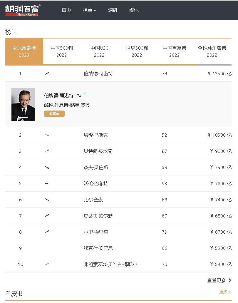 【行業資料】2023胡潤全球富豪榜2023-03-24 【行業資料】2021-2022胡潤中國民營企業百強榜2023-03-24 【行業動態】2022胡潤中國民營企業可持續發展百強榜2023-03-24 【行業動態】2023胡潤全球富豪榜變動劇烈!LV總裁首登首富,445人落選2023-03-24 【行業資料】2022意才·胡潤財富報告2023-03-12 【行業資料】胡潤世界500強2020-20222023-02-01 【行業資料】2019-2022胡潤中國(民營企業)500強排行榜2023-02-01 【行業資料】胡潤全球富豪榜 胡潤中國百富榜總榜單2023-01-29 【行業資料】胡潤百富榜總榜單2023-01-06