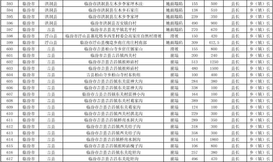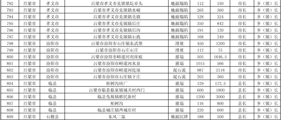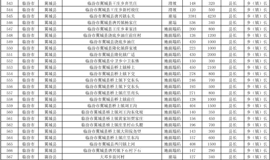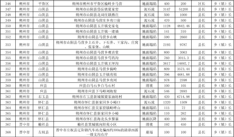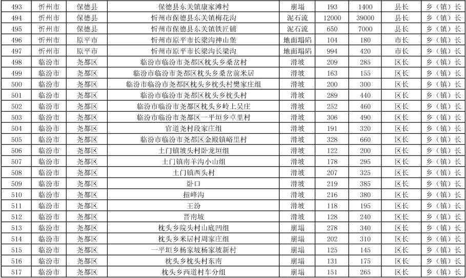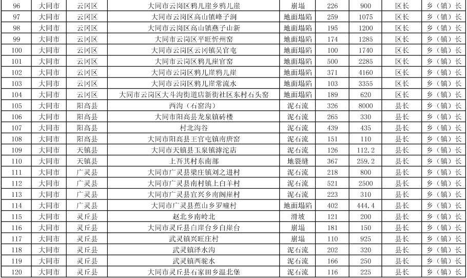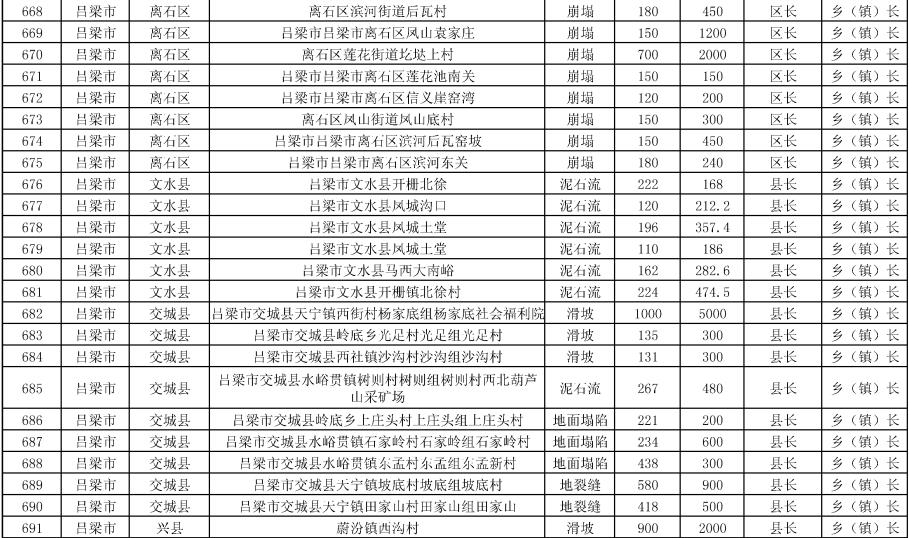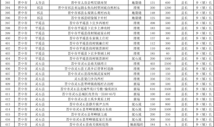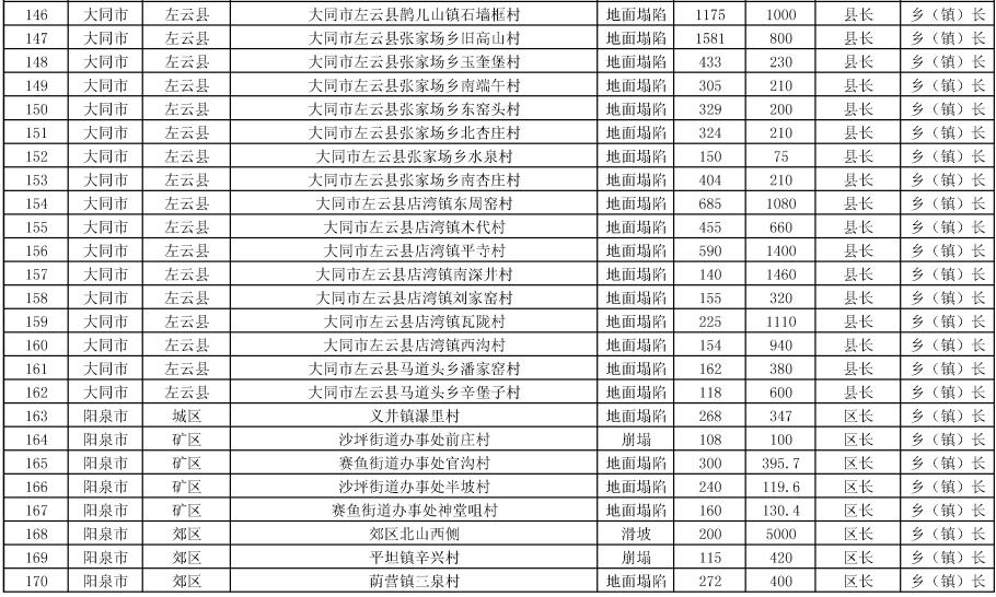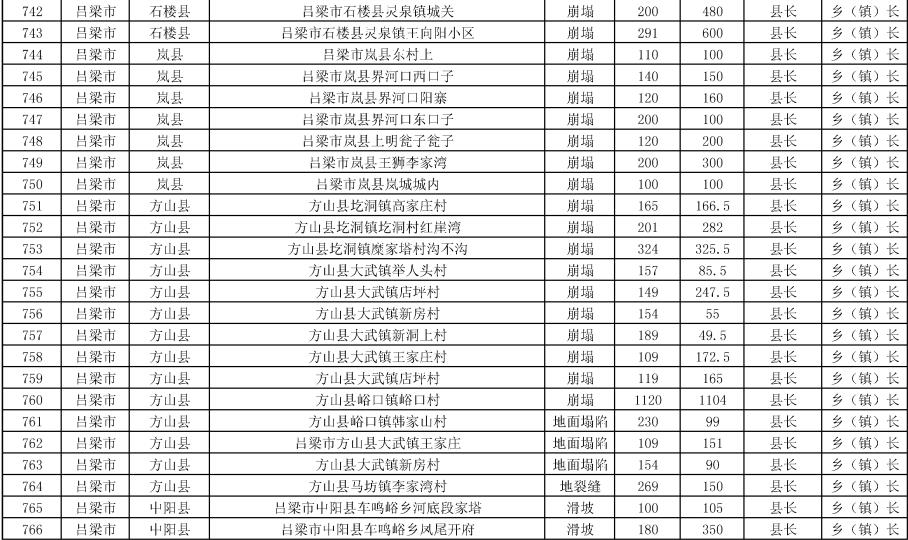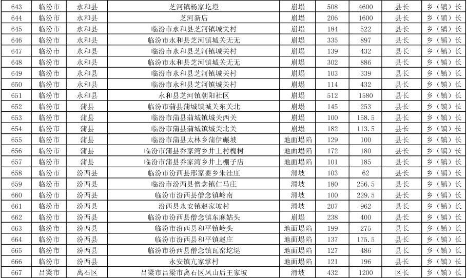 《方案》要求,強化治理搬遷,消除安全隱患。實施中央和省級資金安排9處地質災害治理工程項目。其中,河津市、夏縣、石樓縣、臨縣、永和縣、鄉寧縣、榆社縣各1處,武鄉縣2處。《方案》提出,要把縣級配套資金落實到位,加快項目施工進度,確保今年全部竣工;要推進中央和省級資金安排3397戶農村地質災害避險搬遷工作,落實市縣配套資金,明確時間節點進度,確保年底全面開工,2024年竣工入住。