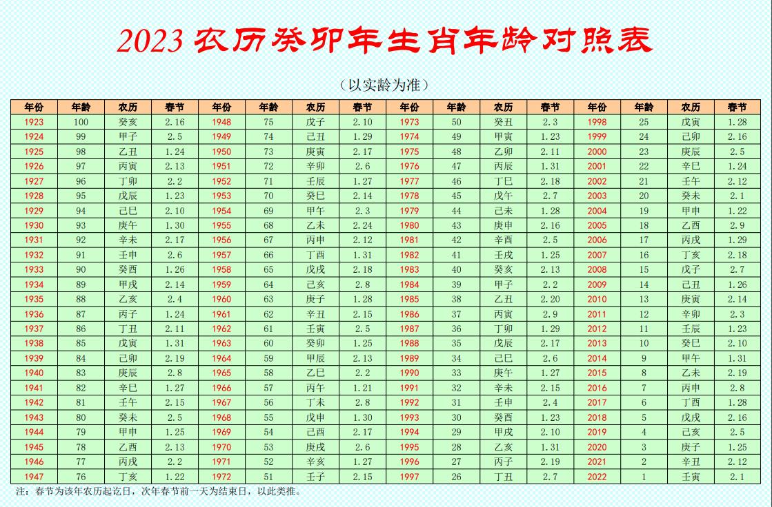 2023農(nóng)歷癸卯年生肖年齡對(duì)照表