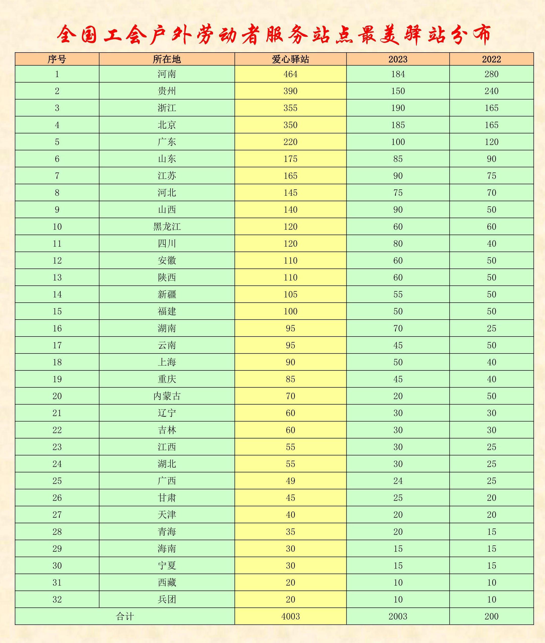 2021年以來,全總已推樹5500個最美驛站,投入資金2750萬元,覆蓋全國31個省、自治區、直轄市和新疆生產建設兵團。“十四五”期間,全總計劃推樹1萬個最美驛站,并給予資金獎補,旨在通過典型引路和示范帶動,進一步規范工會驛站工作,推動各級工會持續提升驛站服務針對性、實效性,增強服務均衡性和可及性,依托工會驛站凝聚社會力量,做好戶外勞動者關心關愛工作。