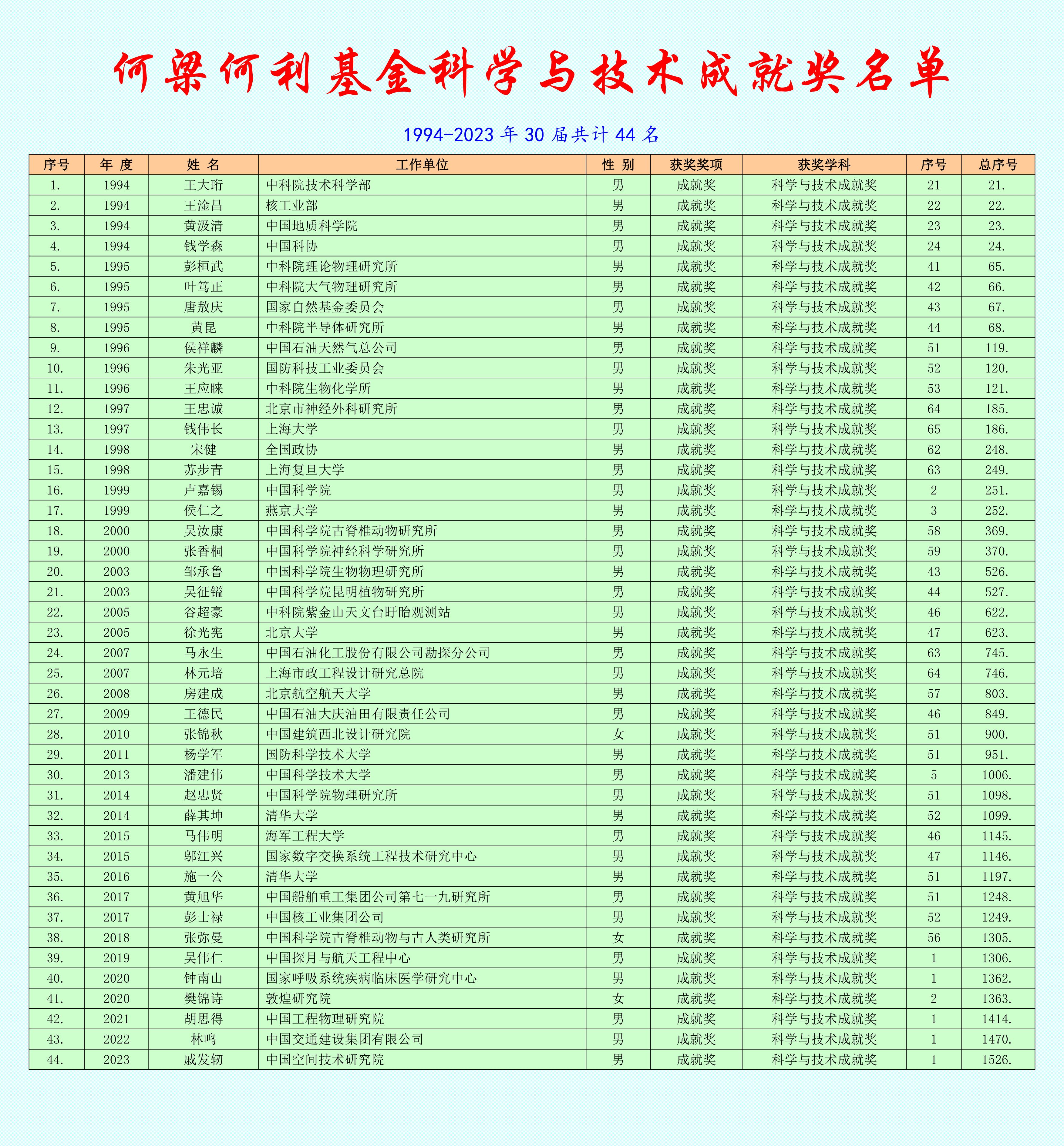 44. 戚發軔 中國空間技術研究院 男 成就獎 科學與技術成就獎 2023 1 1526.