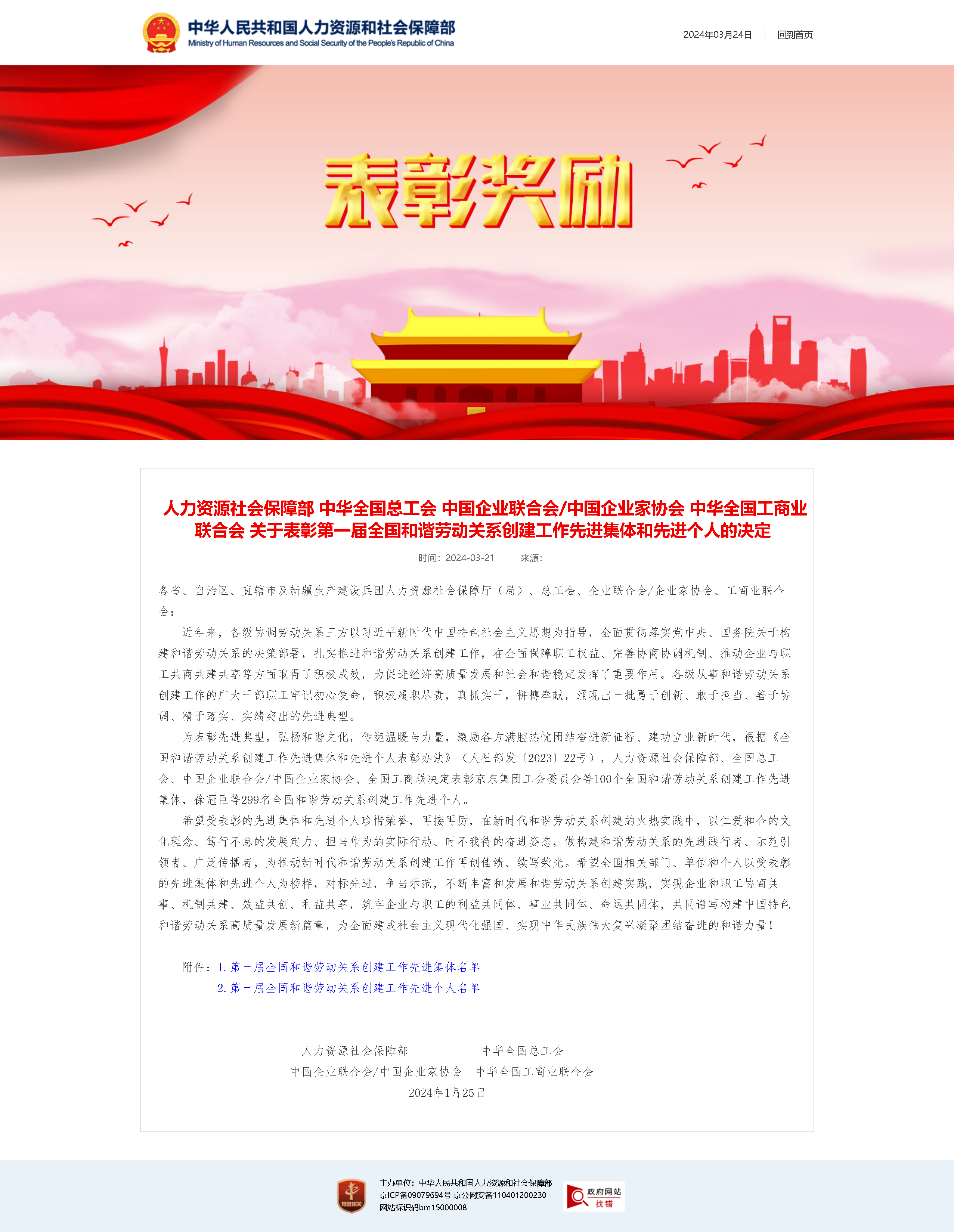 為表彰先進典型,弘揚和諧文化,傳遞溫暖與力量,激勵各方滿腔熱忱團結(jié)奮進新征程、建功立業(yè)新時代,根據(jù)《全國和諧勞動關(guān)系創(chuàng)建工作先進集體和先進個人表彰辦法》(人社部發(fā)〔2023〕22號),人力資源社會保障部、全國總工會、中國企業(yè)聯(lián)合會/中國企業(yè)家協(xié)會、全國工商聯(lián)決定表彰京東集團工會委員會等100個全國和諧勞動關(guān)系創(chuàng)建工作先進集體,徐冠巨等299名全國和諧勞動關(guān)系創(chuàng)建工作先進個人。