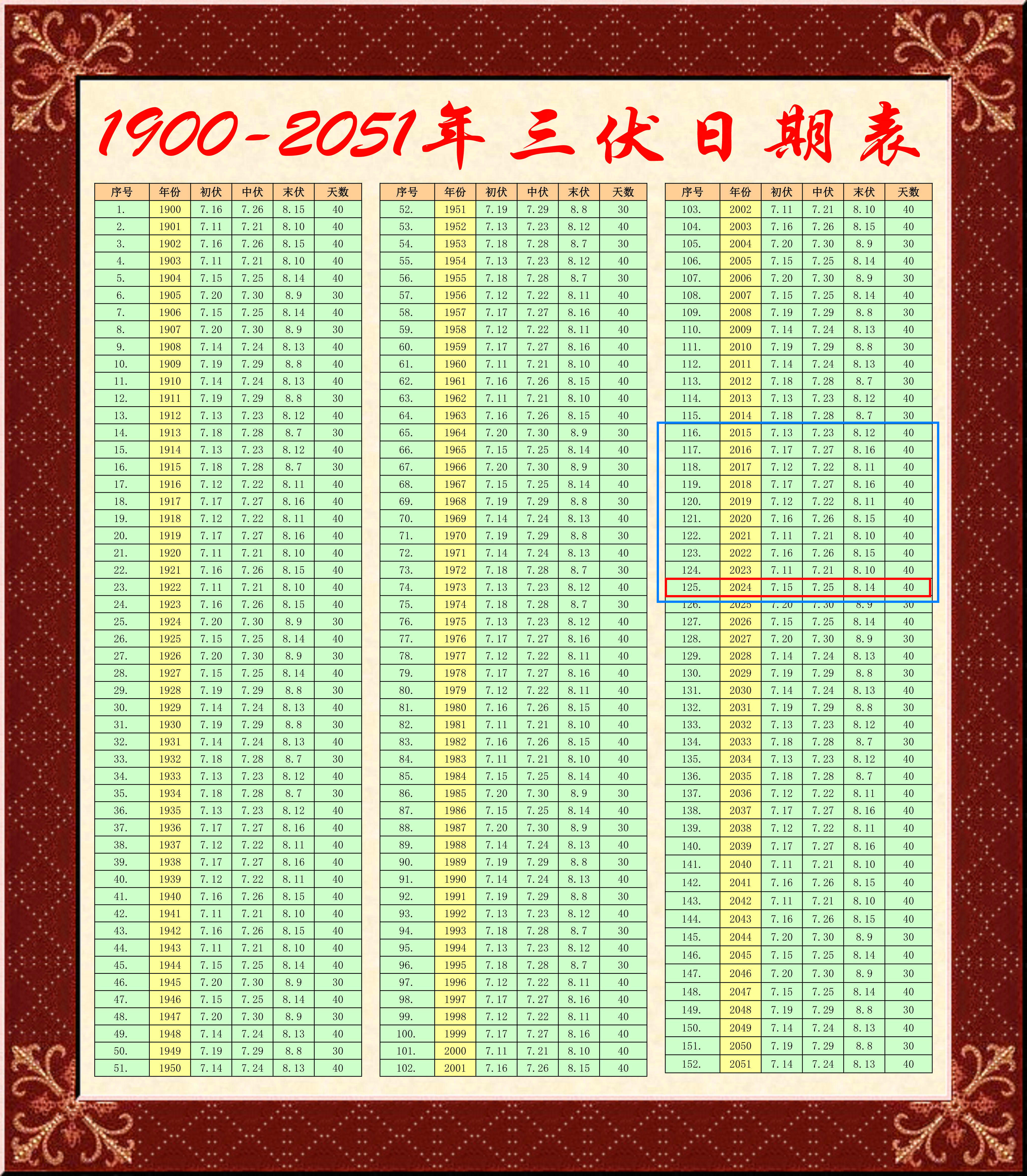 以今年為例,6月21日夏至,從夏至日算起,第一個庚日是6月25日(庚申日),第二個庚日是7月5日(庚午日),第三個庚日是7月15日(庚辰日),第四個庚日是7月25日(庚寅日),第五個庚日是8月4日(庚子日),8月7日立秋,所以今年在夏至與立秋之間有5個庚日,中伏就為20天。而在立秋后的第一個庚日8月14日(庚戌日)才進入末伏。