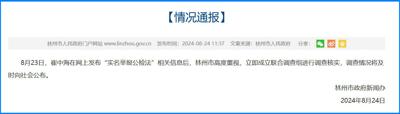 央視網(wǎng)消息:據(jù)林州市人民政府網(wǎng)站消息,河南林州市政府新聞辦通報,8月23日,崔中海在網(wǎng)上發(fā)布“實名舉報公檢法”相關(guān)信息后,林州市高度重視,立即成立聯(lián)合調(diào)查組進行調(diào)查核實,調(diào)查情況將及時向社會公布。