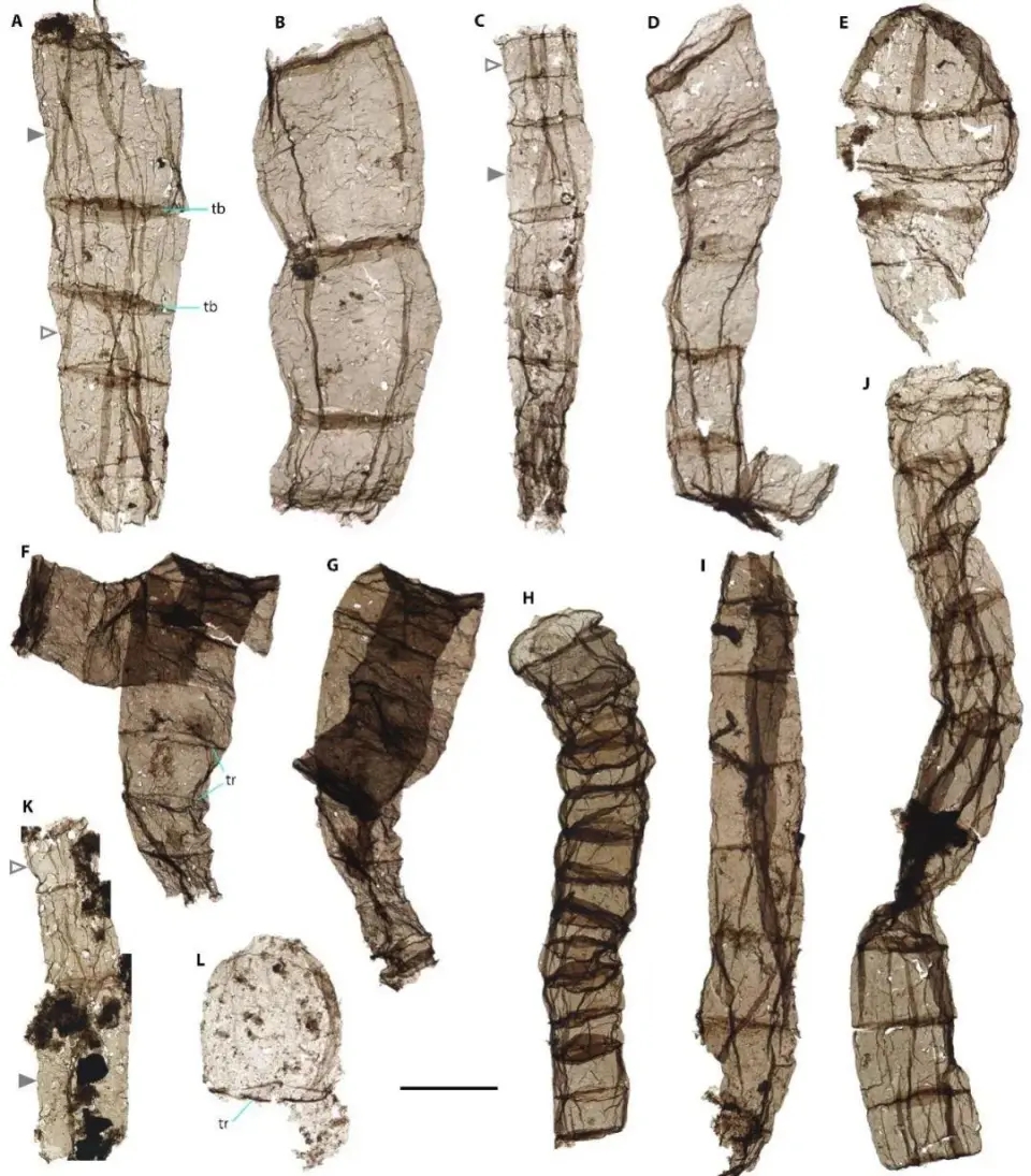 ▲串嶺溝組中發現的壯麗青山藻?;4鏋橛袡C質壁構成的多細胞絲狀體,顯示細胞大小和形態的變化引起的絲狀體形態變化。絲狀體直徑向一端收縮(A-D、F-I、K),絲狀體直徑不變(J),保存有完整端部的絲狀體(E、L)。比例尺對于F-H和K代表100微米,其余的代表50微米。