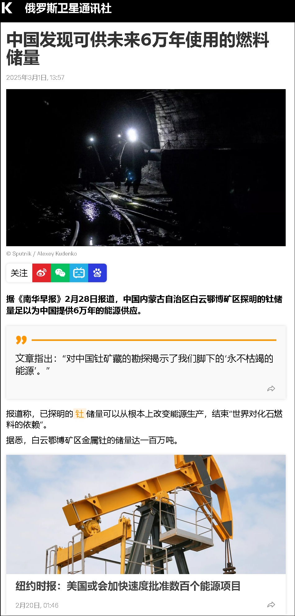 文章指出:“對中國釷礦藏的勘探揭示了我們腳下的‘永不枯竭的能源’。”