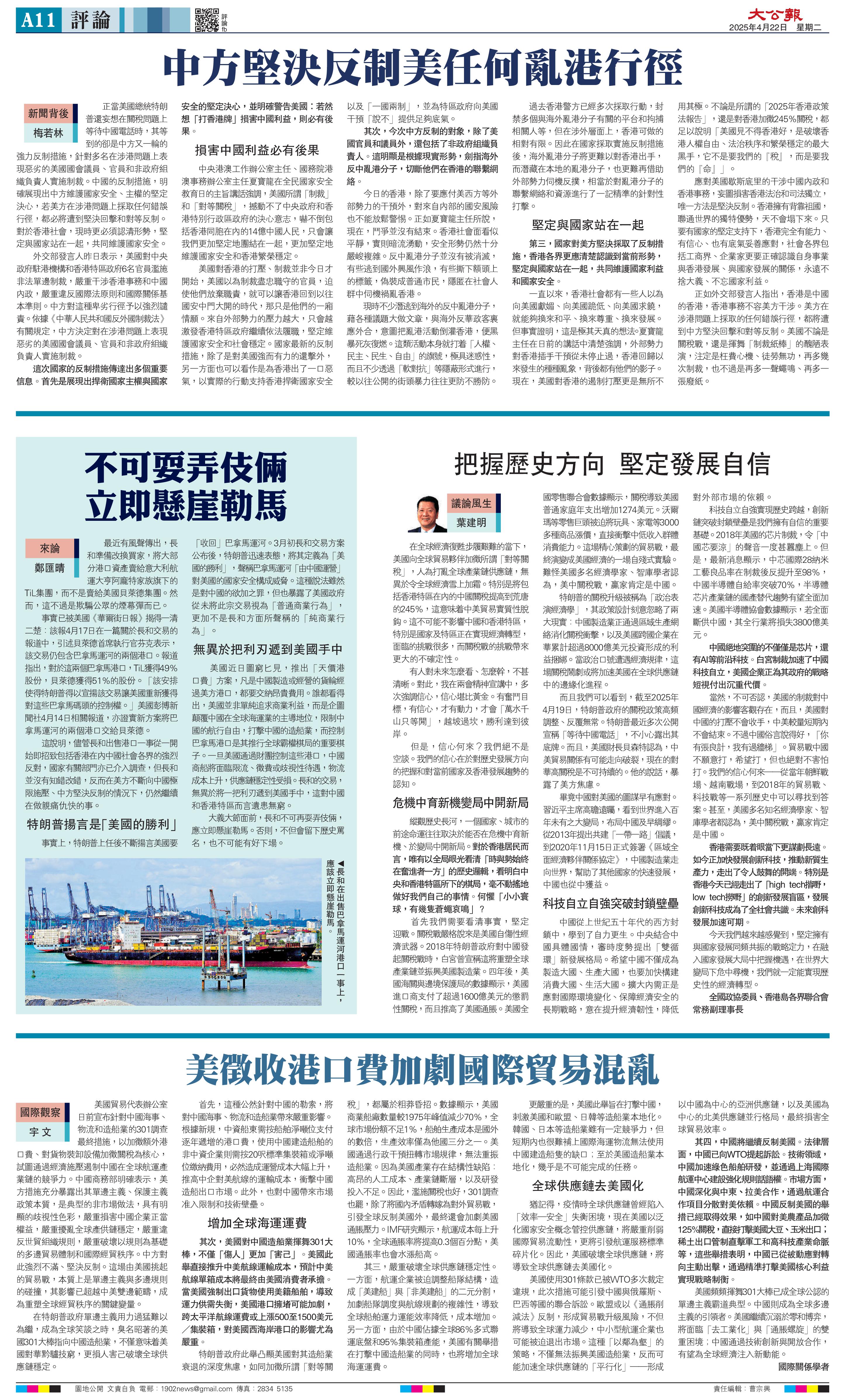 美國近日圖窮匕見,推出「天價港口費」方案,凡是中國制造或經營的貨輪經過美方港口,都要交納昂貴費用。誰都看得出,美國并非單純追求商業利益,而是企圖顛覆中國在全球海運業的主導地位,限制中國的航行自由,打擊中國的造船業,而控制巴拿馬港口是其推行全球霸權棋局的重要棋子。一旦美國通過財團控制這些港口,中國商船將面臨限流、征費或歧視性待遇,物流成本上升,供應鏈穩定性受損。長和的交易,無異于將一把利刃遞到美國手中,這對中國和香港特區而言遺患無窮。