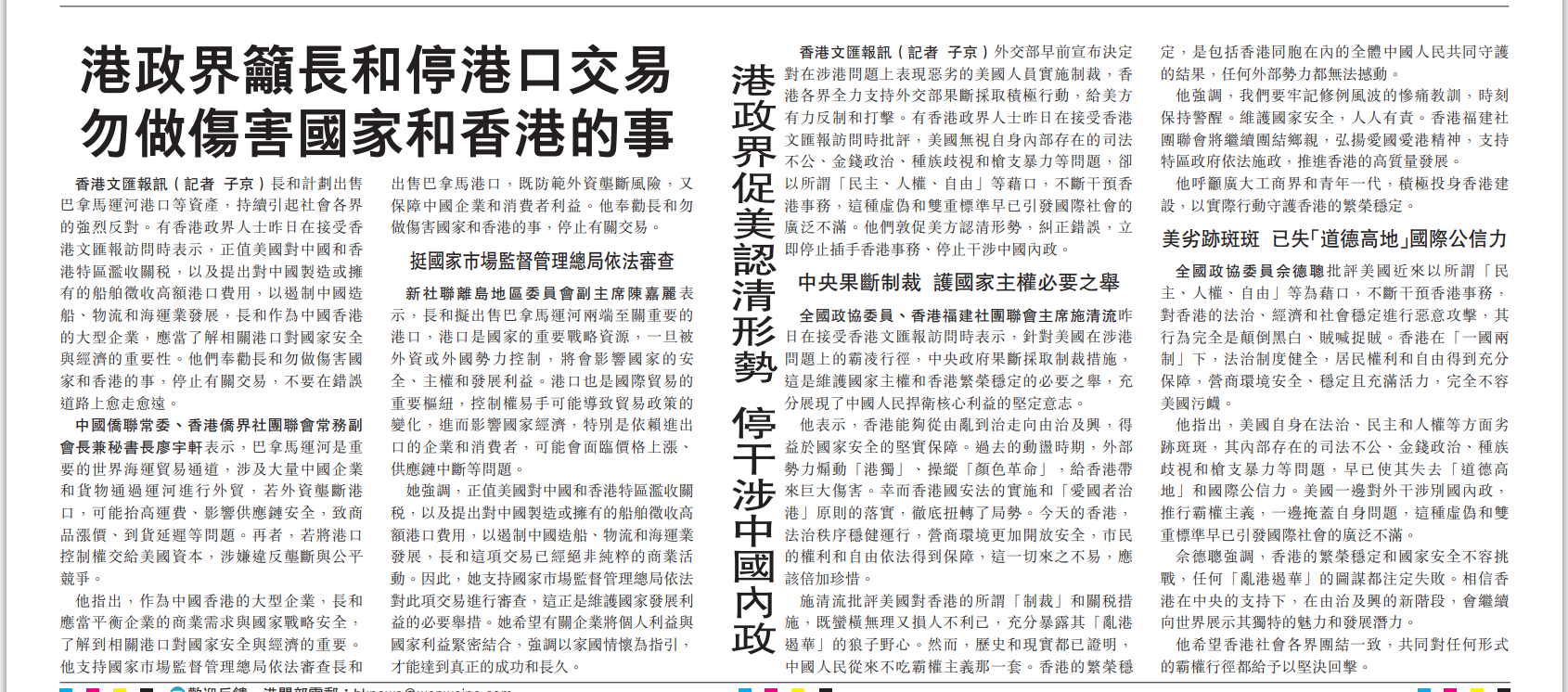 他指出,作為中國香港的大型企業,長和應當平衡企業的商業需求與國家戰略安全,了解到相關港口對國家安全與經濟的重要。他支持國家市場監督管理總局依法審查長和出售巴拿馬港口,既防范外資壟斷風險,又保障中國企業和消費者利益。他奉勸長和勿做傷害國家和香港的事,停止有關交易。