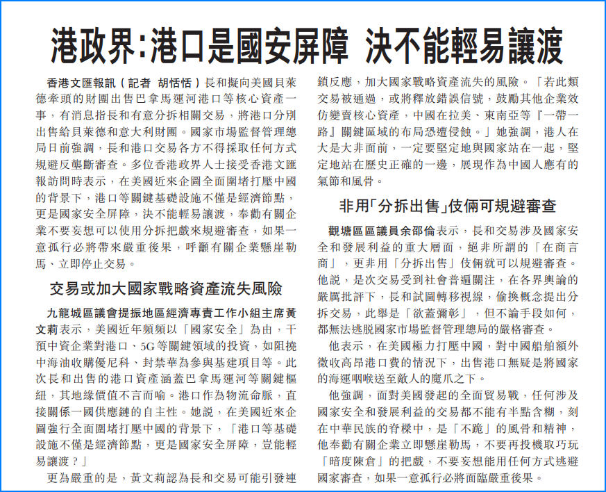 觀塘區(qū)區(qū)議員余邵倫表示,長和交易涉及國家安全和發(fā)展利益的重大層面,絕非所謂的「在商言商」,更非用「分拆出售」伎倆就可以規(guī)避審查。他說,是次交易受到社會普遍關(guān)注,在各界輿論的嚴(yán)厲批評下,長和試圖轉(zhuǎn)移視線,偷換概念提出分拆交易,此舉是「欲蓋彌彰」,但不論手段如何,都無法逃脫國家市場監(jiān)督管理總局的嚴(yán)格審查。