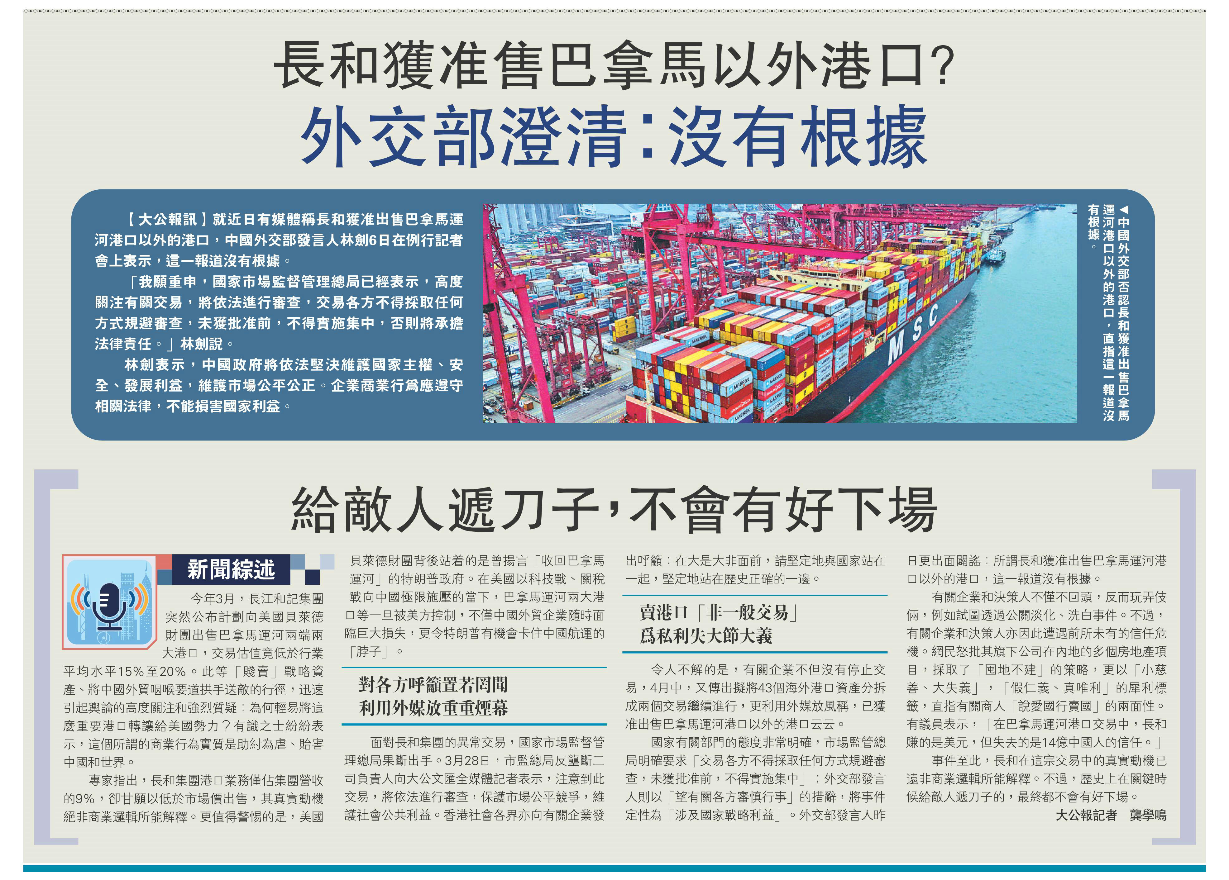 令人不解的是,有關企業不但沒有停止交易,4月中,又傳出擬將43個海外港口資產分拆成兩個交易繼續進行,更利用外媒放風稱,已獲準出售巴拿馬運河港口以外的港口云云。