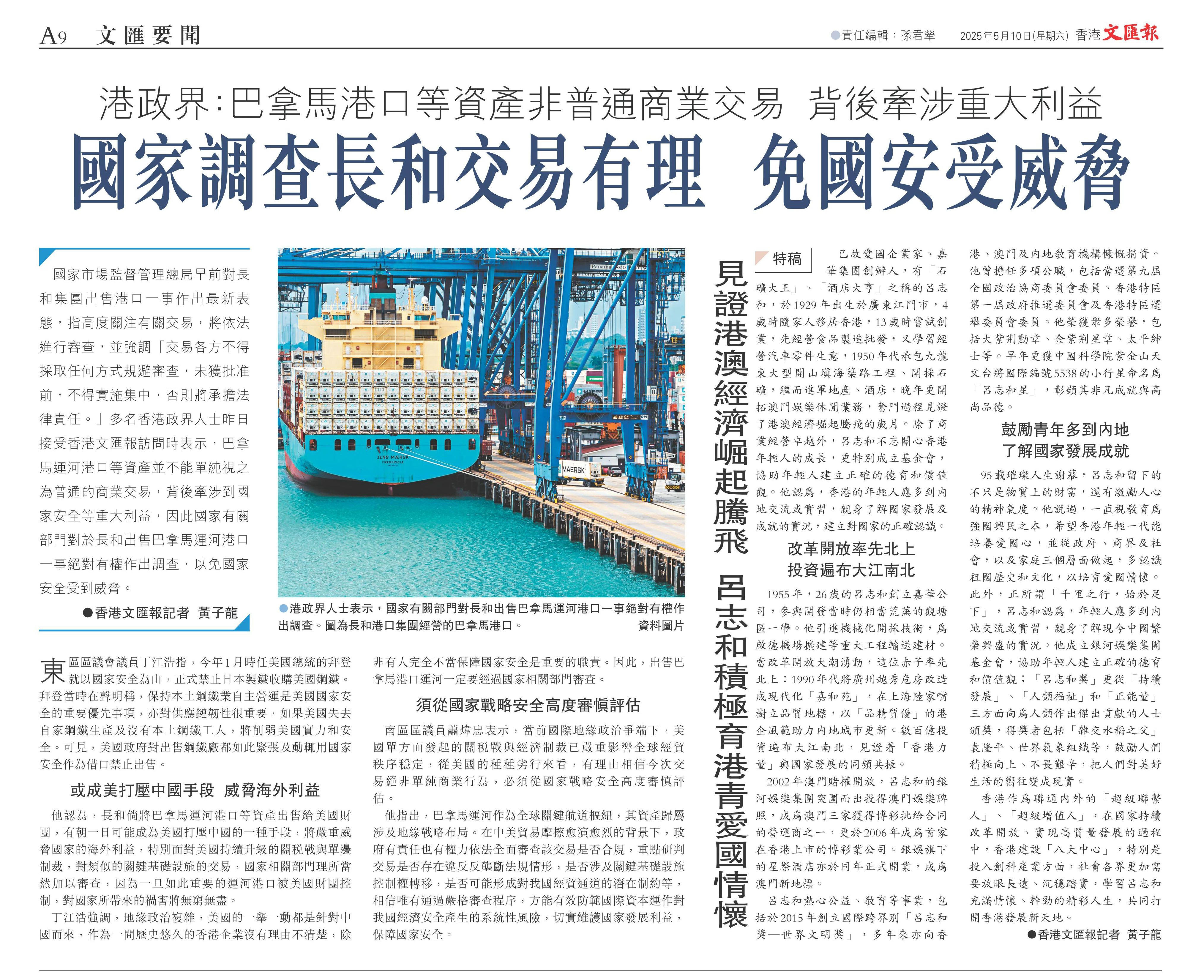 國家市場監(jiān)督管理總局早前對長和集團出售港口一事作出最新表態(tài),指高度關(guān)注有關(guān)交易,將依法進行審查,并強調(diào)「交易各方不得采取任何方式規(guī)避審查,未獲批準前,不得實施集中,否則將承擔法律責任。」多名香港政界人士昨日接受香港文匯報訪問時表示,巴拿馬運河港口等資產(chǎn)并不能單純視之為普通的商業(yè)交易,背后牽涉到國家安全等重大利益,因此國家有關(guān)部門對于長和出售巴拿馬運河港口一事絕對有權(quán)作出調(diào)查,以免國家安全受到威脅。