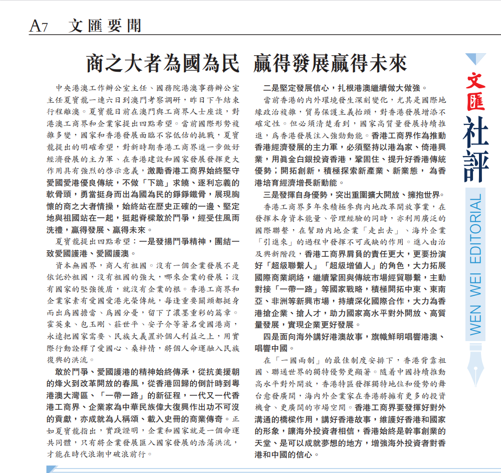 中央港澳工作辦公室主任、國務(wù)院港澳事務(wù)辦公室主任夏寶龍一連六日到澳門考察調(diào)研,昨日下午結(jié)束行程離澳。夏寶龍日前在澳門與工商界人士座談,對(duì)港澳工商界和企業(yè)家提出四點(diǎn)希望。當(dāng)前國際形勢(shì)復(fù)雜多變,國家和香港發(fā)展面臨不容低估的挑戰(zhàn),夏寶龍?zhí)岢龅拿鞔_希望,對(duì)新時(shí)期香港工商界進(jìn)一步做好經(jīng)濟(jì)發(fā)展的主力軍、在香港建設(shè)和國家發(fā)展發(fā)揮更大作用具有強(qiáng)烈的啟示意義,激勵(lì)香港工商界始終堅(jiān)守愛國愛港優(yōu)良傳統(tǒng),不做「下跪」求饒、逐利忘義的軟骨頭,勇當(dāng)挺身而出為國為民的錚錚鐵骨,展現(xiàn)胸懷的商之大者情操,始終站在歷史正確的一邊、堅(jiān)定地與祖國站在一起,挺起脊梁敢于斗爭(zhēng),經(jīng)受住風(fēng)雨洗禮,贏得發(fā)展、贏得未來。
