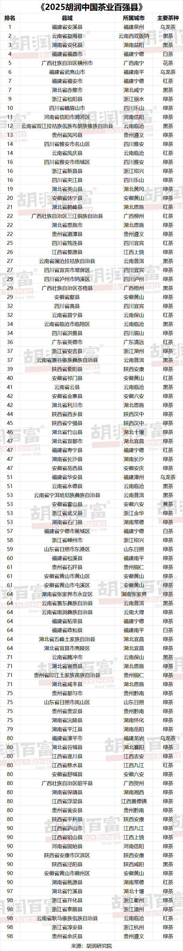 《2025胡潤中國茶業百強縣》省份分布