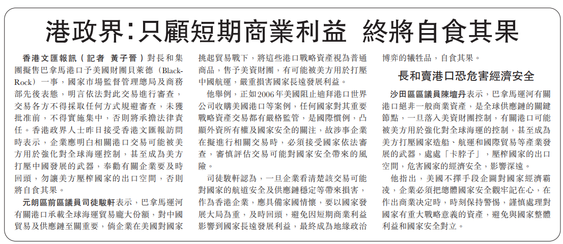 香港文匯報訊(記者黃子晉)對長和集團擬售巴拿馬港口予美國財團貝萊德(BlackRock)一事,國家市場監督管理總局及商務部先后表態,明言依法對此交易進行審查,交易各方不得采取任何方式規避審查,未獲批準前,不得實施集中,否則將承擔法律責任。香港政界人士昨日接受香港文匯報訪問時表示,企業應明白相關港口交易可能被美方用于強化對全球海運控制,甚至成為美方打壓中國發展的武器,奉勸有關企業要及時回頭,勿讓美方壓榨國家的出口空間,否則將自食其果。