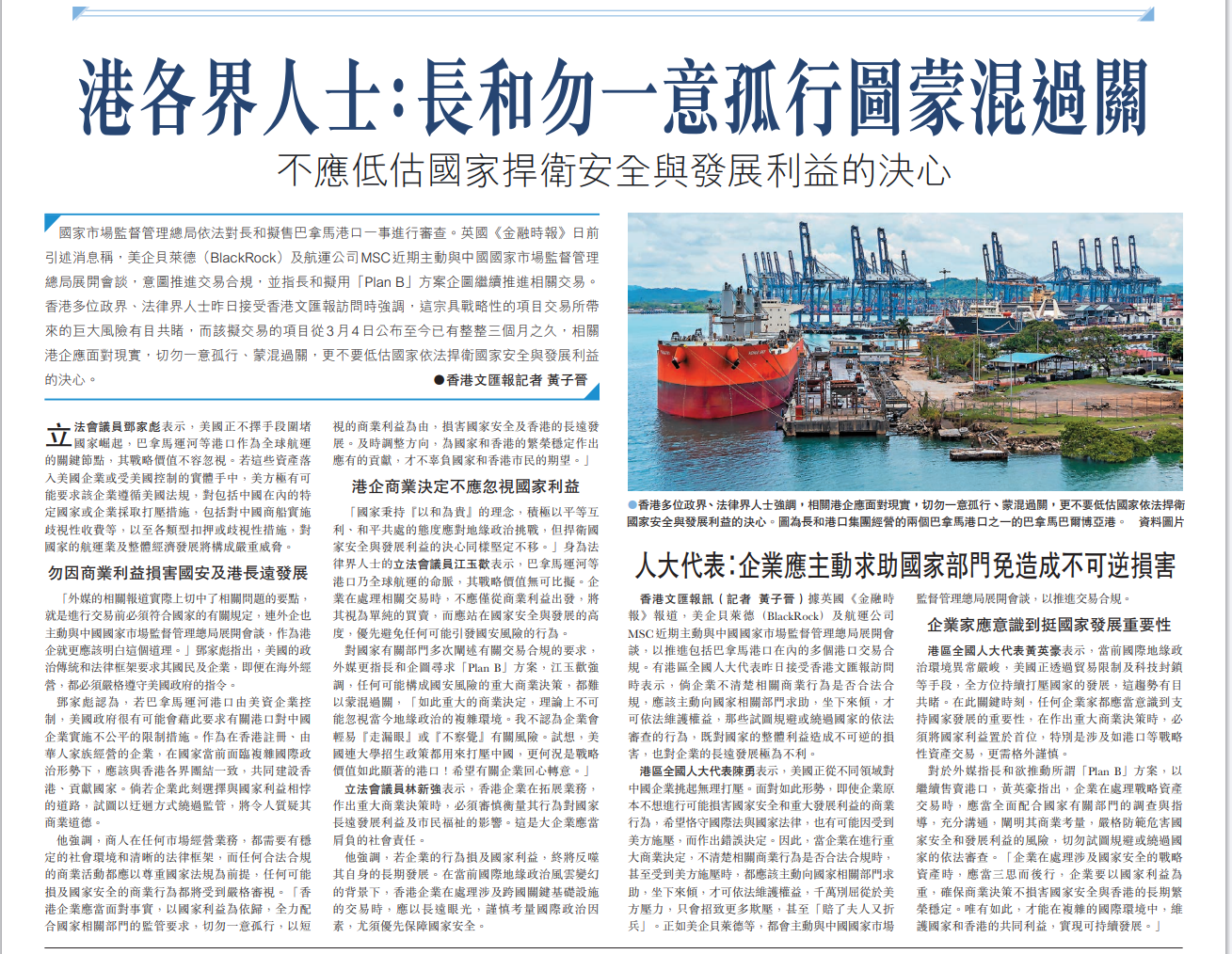 他強調,若企業的行為損及國家利益,終將反噬其自身的長期發展。在當前國際地緣政治風云變幻的背景下,香港企業在處理涉及跨國關鍵基礎設施的交易時,應以長遠眼光,謹慎考量國際政治因素,尤須優先保障國家安全。