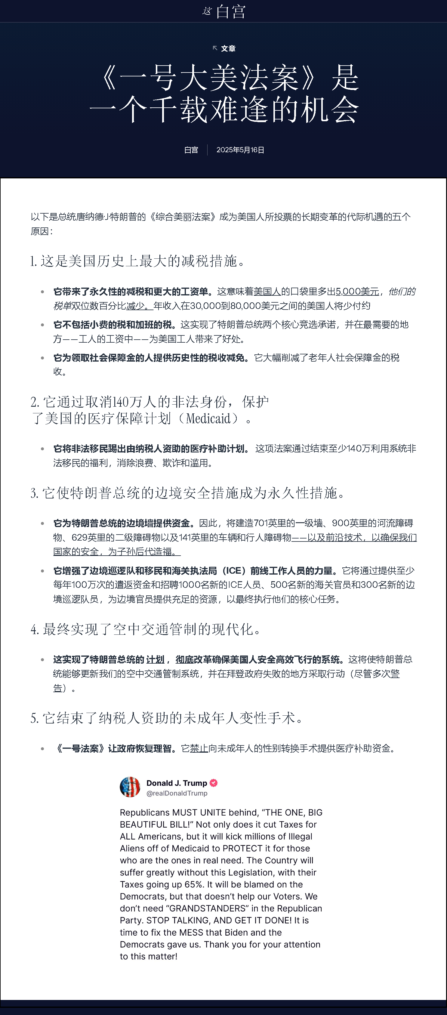 上月,美國共和黨人占據多數的國會眾議院以一票優勢艱難通過被美國總統特朗普稱為“大而美”的大規模稅收與支出法案。據悉,該法案包含多項條款,內容超過1000頁,主要側重于減稅和削減開支。法案將延長特朗普在其第一個總統任期內于2017年通過的企業和個人減稅措施,對小費、汽車貸款等提供新的稅收減免,同時增加國防支出,并為打擊非法移民提供更多資金。