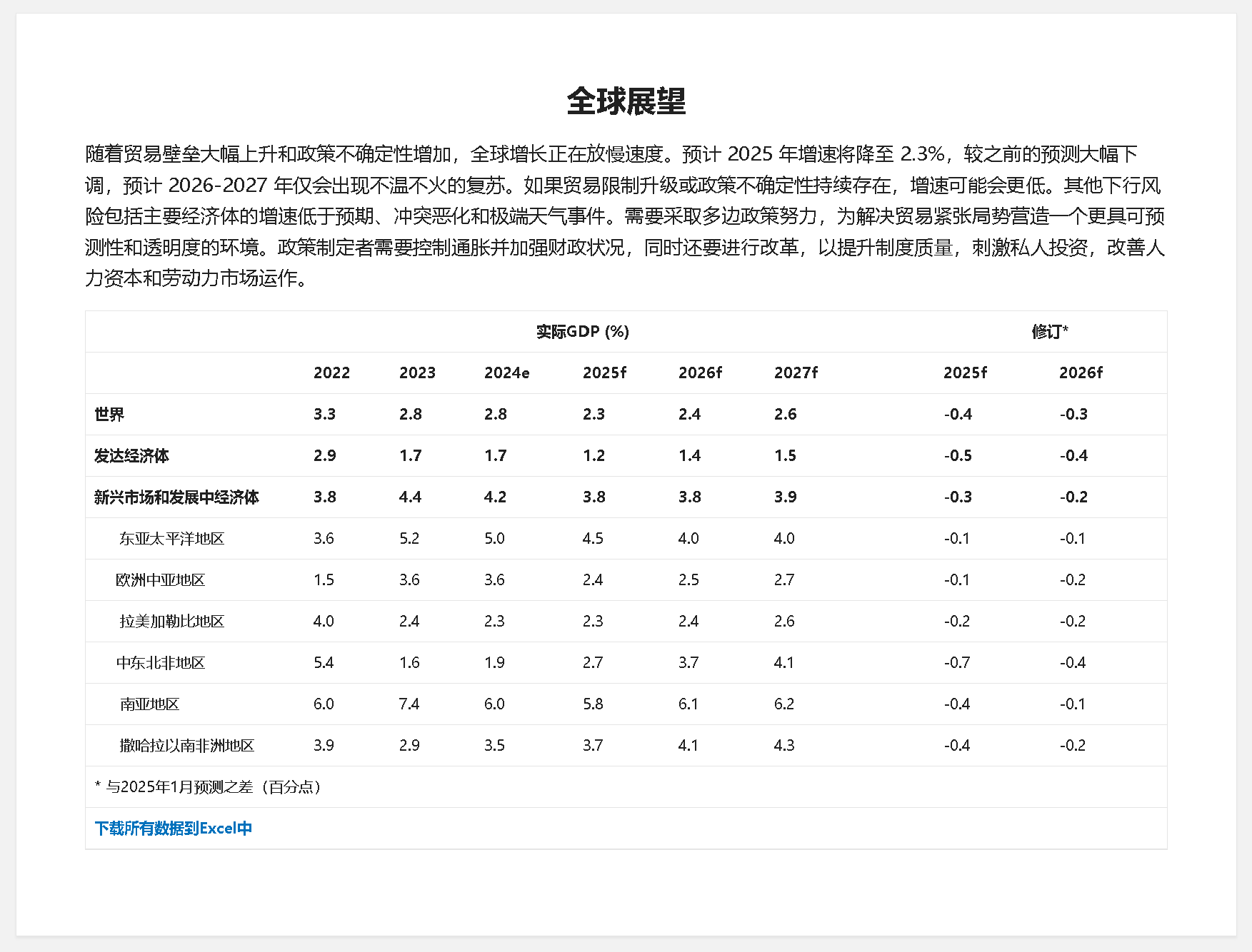 根據世界銀行報告,全球經濟在2026年和2027年將出現疲弱反彈。新興市場和發展中經濟體在縮小與發達經濟體人均收入差距和減少極端貧困方面的進展仍將不足,其前景很大程度上依賴于全球貿易政策的變化。