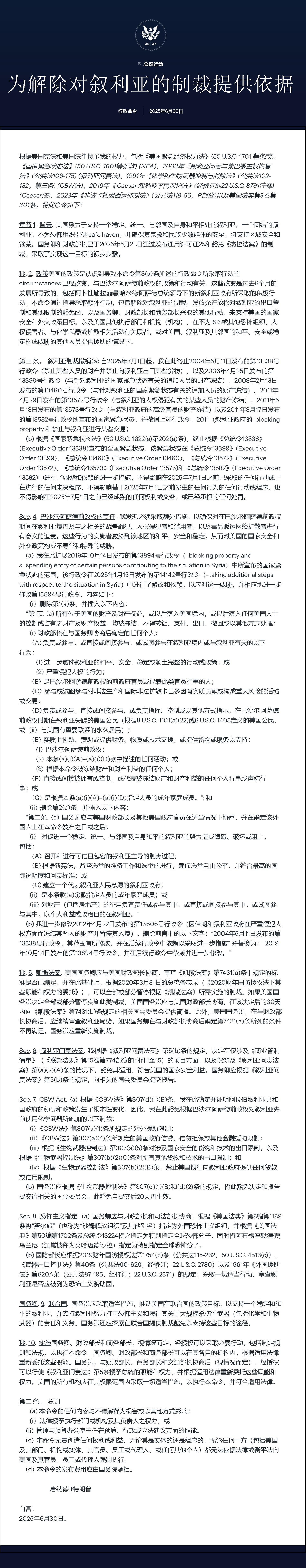 根據行政令,美國將放寬對某些商品出口敘利亞的管制,并免除對敘利亞接受某些外國援助的限制。美國財政部此前已發布涉及敘利亞當局、敘中央銀行和國有企業的往來許可,美國國務院也發布了為期180天的制裁豁免。