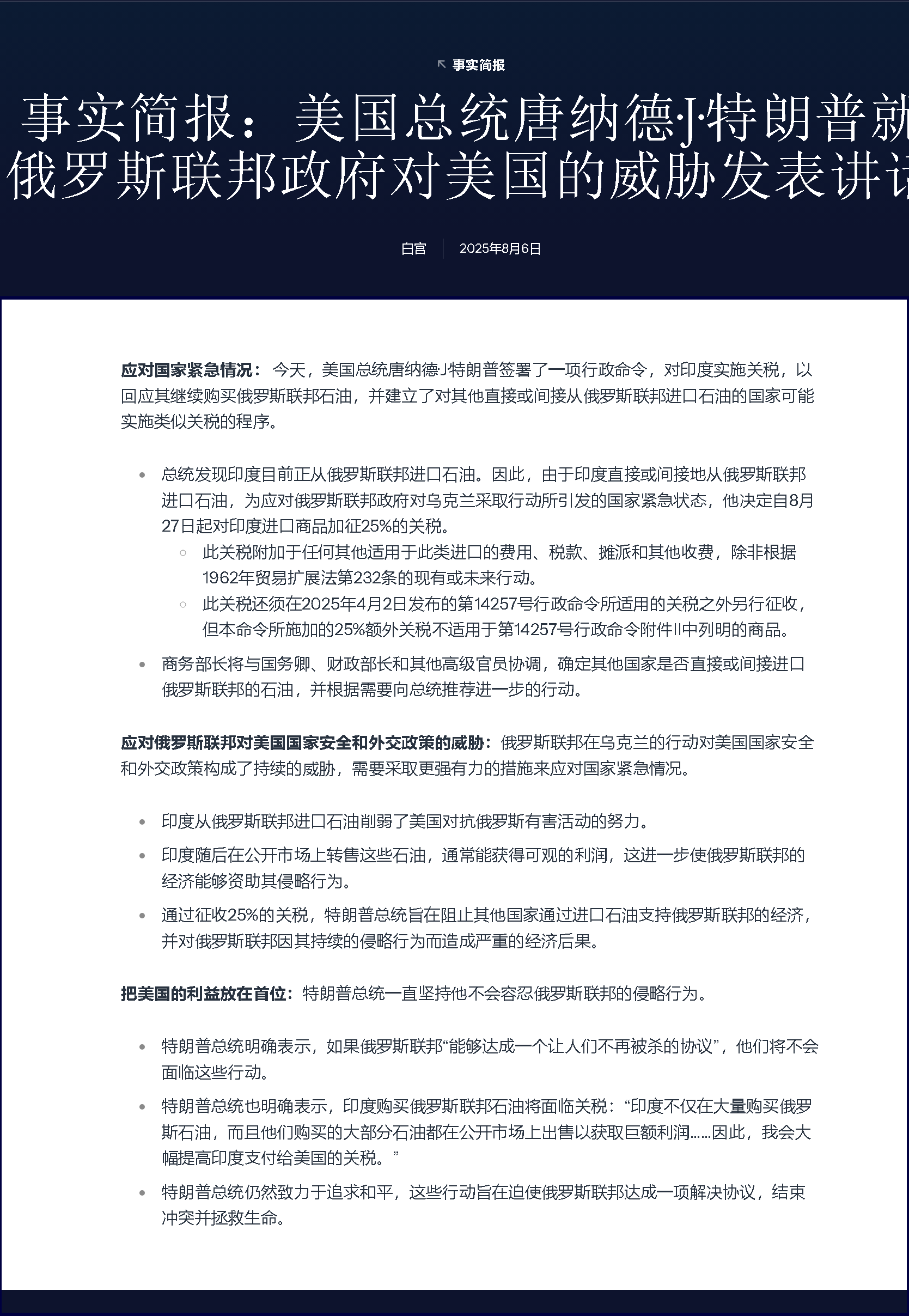 總統發現印度目前正從俄羅斯聯邦進口石油。因此,由于印度直接或間接地從俄羅斯聯邦進口石油,為應對俄羅斯聯邦政府對烏克蘭采取行動所引發的國家緊急狀態,他決定自8月27日起對印度進口商品加征25%的關稅。