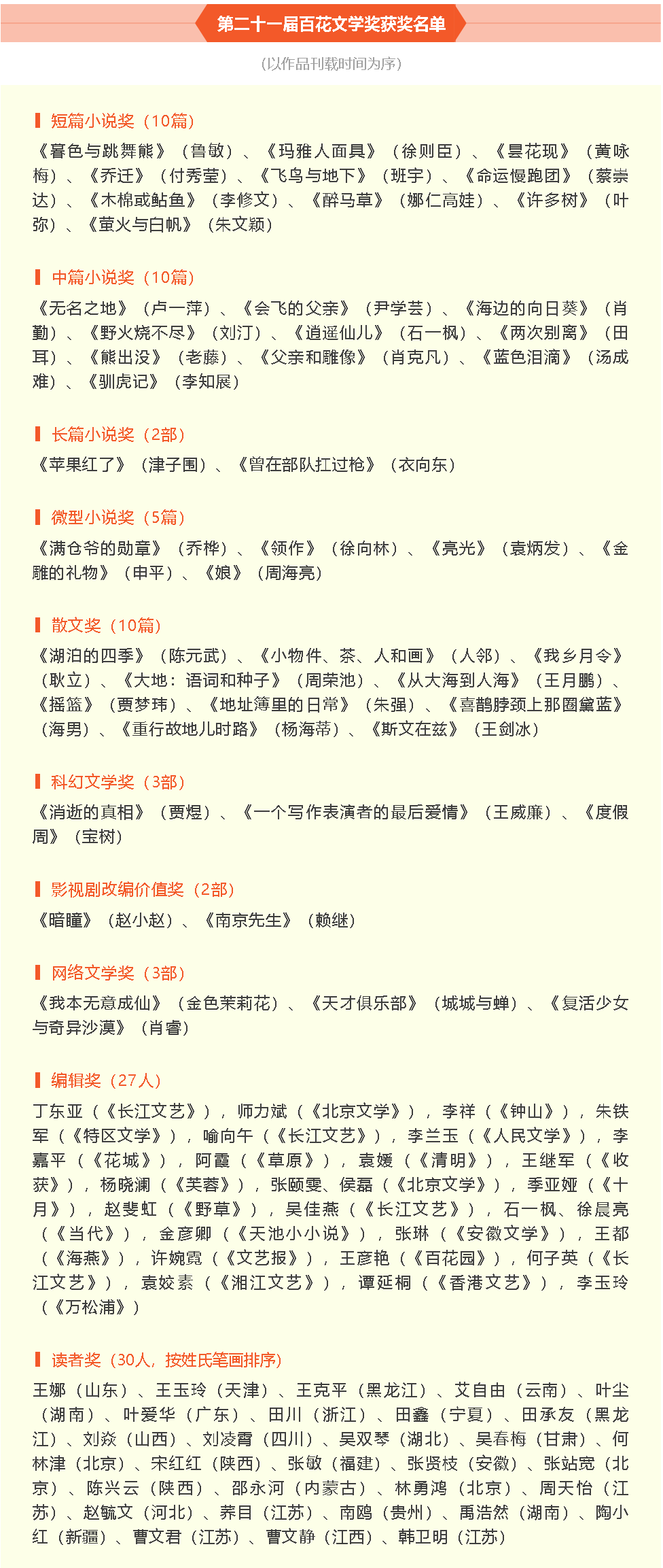 經(jīng)過讀者線上線下投票和專家評(píng)審,共評(píng)選出短篇小說獎(jiǎng)10篇,中篇小說獎(jiǎng)10篇,長(zhǎng)篇小說獎(jiǎng)2篇,微型小說獎(jiǎng)5篇,影視劇改編價(jià)值獎(jiǎng)2篇,散文獎(jiǎng)10篇,科幻文學(xué)獎(jiǎng)3篇,網(wǎng)絡(luò)文學(xué)獎(jiǎng)3篇。