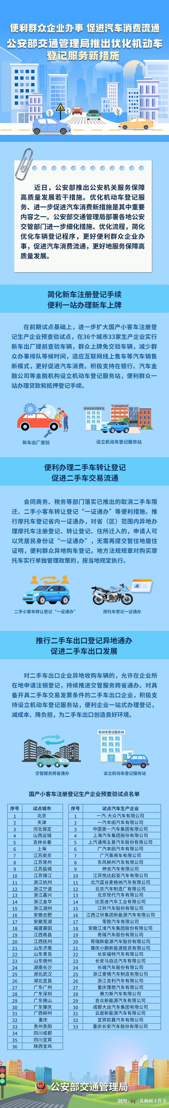 一、簡化新車注冊登記手續,便利一站辦理新車上牌。在前期試點基礎上,進一步擴大國產小客車注冊登記生產企業預查驗試點,在36個城市33家生產企業實行新車出廠提前查驗車輛,群眾上牌免交驗車輛,減少群眾辦事排隊等候時間,適應互聯網線上售車等汽車銷售新模式,更好促進汽車消費。積極支持在銀行、汽車金融公司等金融機構設立機動車登記服務站,便利群眾一站辦理貸款和抵押登記手續。