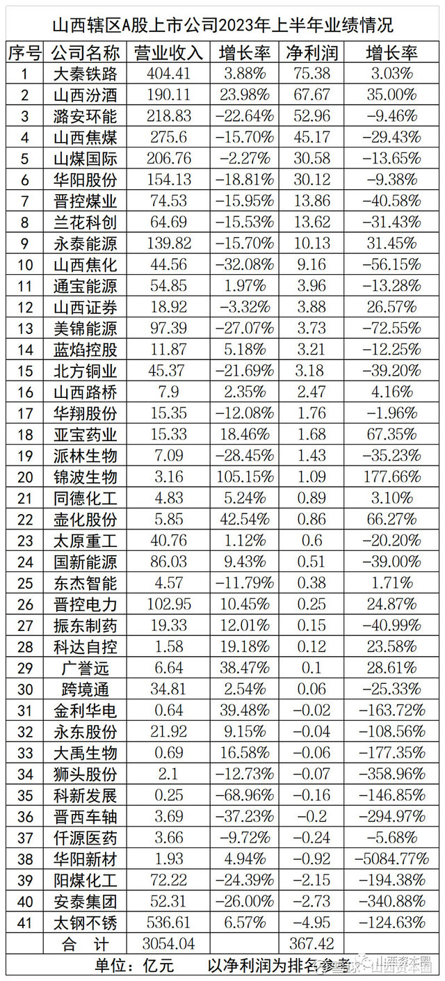 以下為山西41家A股上市公司業績情況(以凈利潤為排名參考):